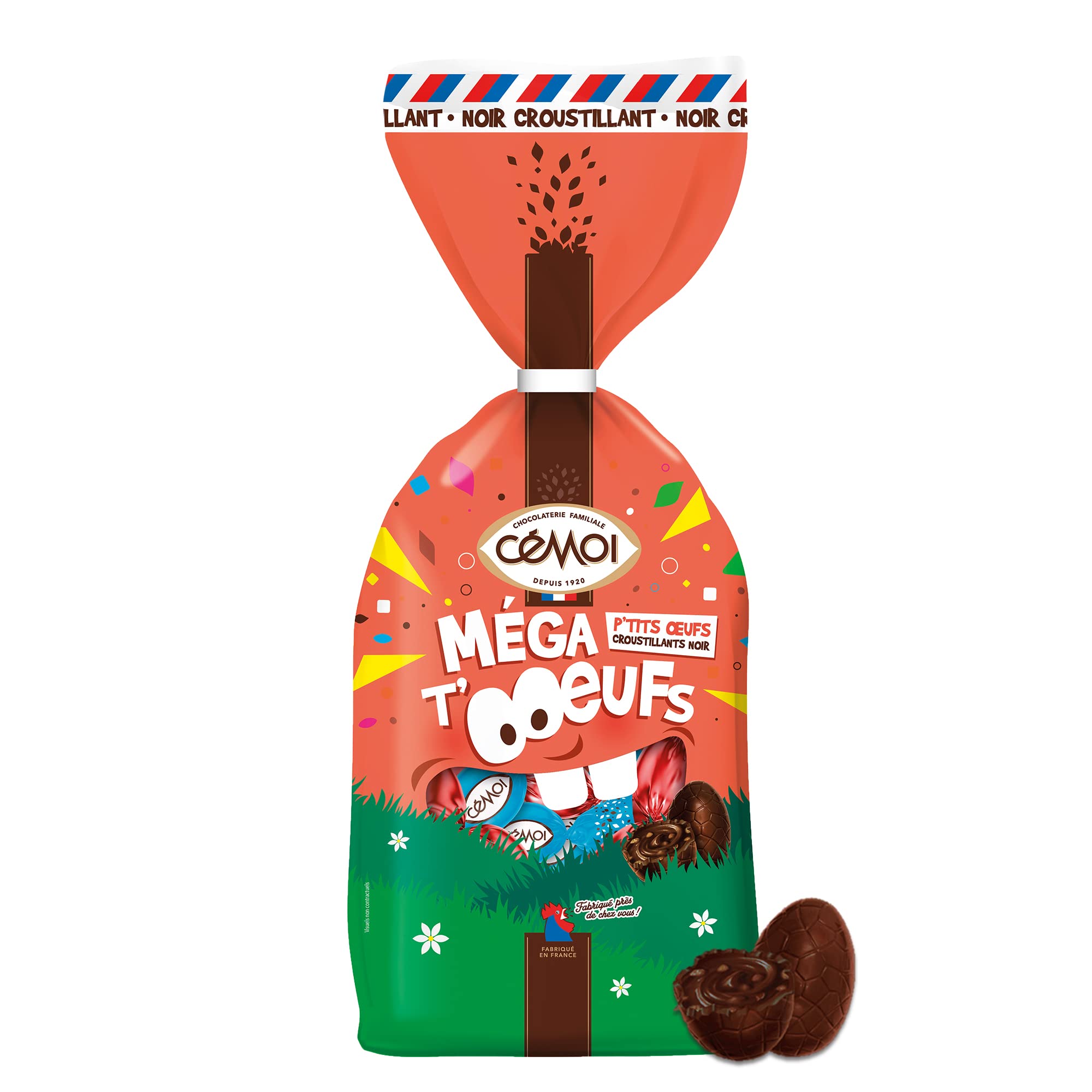 : A more indulgent Easter egg hunt with Mega Eggs! Discover colorful eggs and a variety of recipes in a generous size, perfect for sharing with the family! Product made in France at our chocolate factory in Troyes. Ingredients: Dark chocolate (sugar, cocoa mass, cocoa butter, pastry BUTTER, emulsifiers: lecithins, natural vanilla flavoring), sugar, vegetable fats (palm kernel, palm), praline 9 (HAZELNUT paste, sugar), LACTOSE, whey powder, crispy cereals 2 (rice flour, WHEAT flour, WHEAT gluten, sugar, WHEAT malt, emulsifier: lecithins, salt), fat-reduced cocoa powder, sunflower and or rapeseed oil, emulsifier: lecithins, natural flavoring. Dark chocolate: 45 cocoa minimum. May contain other TREE NUTS.A more indulgent Easter egg hunt with Mega Eggs! Discover colorful eggs and a variety of recipes in a generous size, perfect for sharing with the family! Product made in France at our chocolate factory in Troyes.Description du produit Une chasse aux œufs plus gourmande avec Méga T'oeufs ! Retrouvez des œufs colorés et des recettes variées dans un format généreux, pour des moments de partage en famille! Produit fabriqué en France dans notre chocolaterie de Troyes. Ingrédients Chocolat noir (sucre, pâte de cacao, beurre de cacao, BEURRE pâtissier, émulsifiants : lécithines, arôme naturel de vanille), sucre, graisses végétales (palmiste, palme), praliné 9 (pâte de NOISETTES, sucre), LACTOSE, LACTOSERUM en poudre, céréales croustillantes 2 (farine de riz, farine de BLE, gluten de BLE, sucre, malt de BLE, émulsifiant : lécithines, sel), cacao maigre en poudre, huile de tournesol et ou colza, émulsifiant : lécithines, arôme naturel. Chocolat noir : 45 de cacao minimum. Peut contenir d'autres FRUITS A COQUE.Une chasse aux œufs plus gourmande avec Méga T'oeufs ! Retrouvez des œufs colorés et des recettes variées dans un format généreux, pour des moments de partage en famille! Produit fabriqué en France dans notre chocolaterie de Troyes.Cémoi - Sachet Œufs de Pâques Méga T'Œufs Noir Croustillant 197g