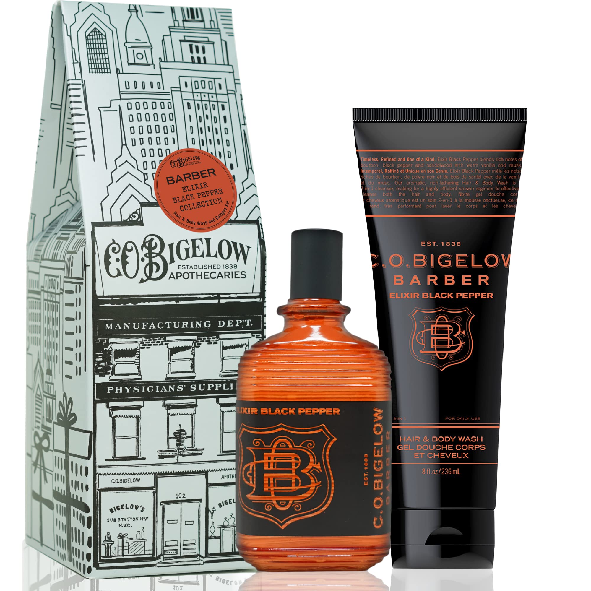 Elevate your body care routine with the C.O. Bigelow Apothecary Box: a beautifully packaged duo that delivers both cleansing and hydration with two of our Elixir Black Pepper products. This 2 piece set includes one full-size Hair Body Wash and one full-size cologne for men, beautifully packaged in an apothecary box illustrated with the iconic C.O. Bigelow storefront and NYC cityscape. The aromatic, rich-lathering hair and body wash is a 2-in-1 cleanser, making for a highly efficient shower regimen to effectively cleanse both the hair and the body. If you're gifting for a birthday, Father's Day, holiday, or simply offering an everyday upgrade, this set makes an ideal present for any man who appreciates quality grooming. Packaged in a sleek, ready-to-gift box, it's perfect for the guy who likes his routine simple, smart, and effective.