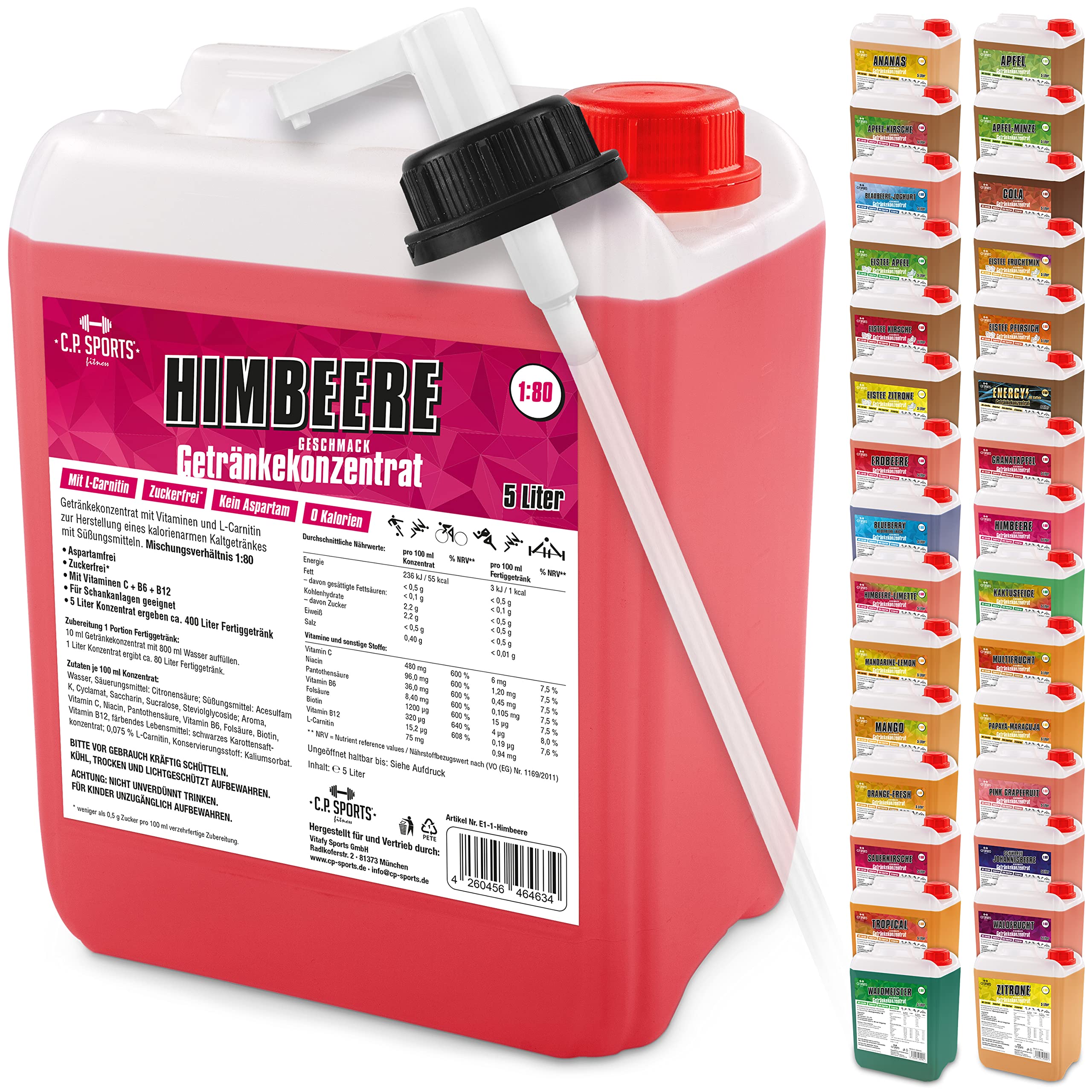 Scope of delivery: 1 canister 5 liters of beverage concentrate dosing pump - flavor: raspberry.Qualitative!C.P.Sports is the brand when it comes to everything that is essential for your training.We have an extensive range of strong products for strong people at home and abroad and are Germany's largest manufacturer and supplier of first-class cafts sports, bodybuilding and fitness equipment.Economically: particularly productive mixing ratio 1:80 (2.5 ml concentrate with 200 ml of water results in one portion - 1 liter concentrate is sufficient for approx. 80 liters of finished drink).The filling quantity of a 5 -liter canister thus results in up to 400 liters of finished drink, ideal for long and economic reach with commercial serving.PROFESSIONAL!Delivery in a 5 -liter canister, suitable for bar systems and tap systems, for example in gyms.Including a practical and easy to clean C.P.Sports dosing dispenser, for simple and accurate dosing (5ml pump stroke), with a screw cap DIN standard thread of 45mm.YUMMY!Aspartam-free and low-calorie beverage concentrate for the production of refreshment drinks for sports and leisure-sugar-free and without artificial dyes, with natural flavors, from purest spring water, with L-carnitine and various vitamins.Numerous delicious flavors from pineapple to lemon.