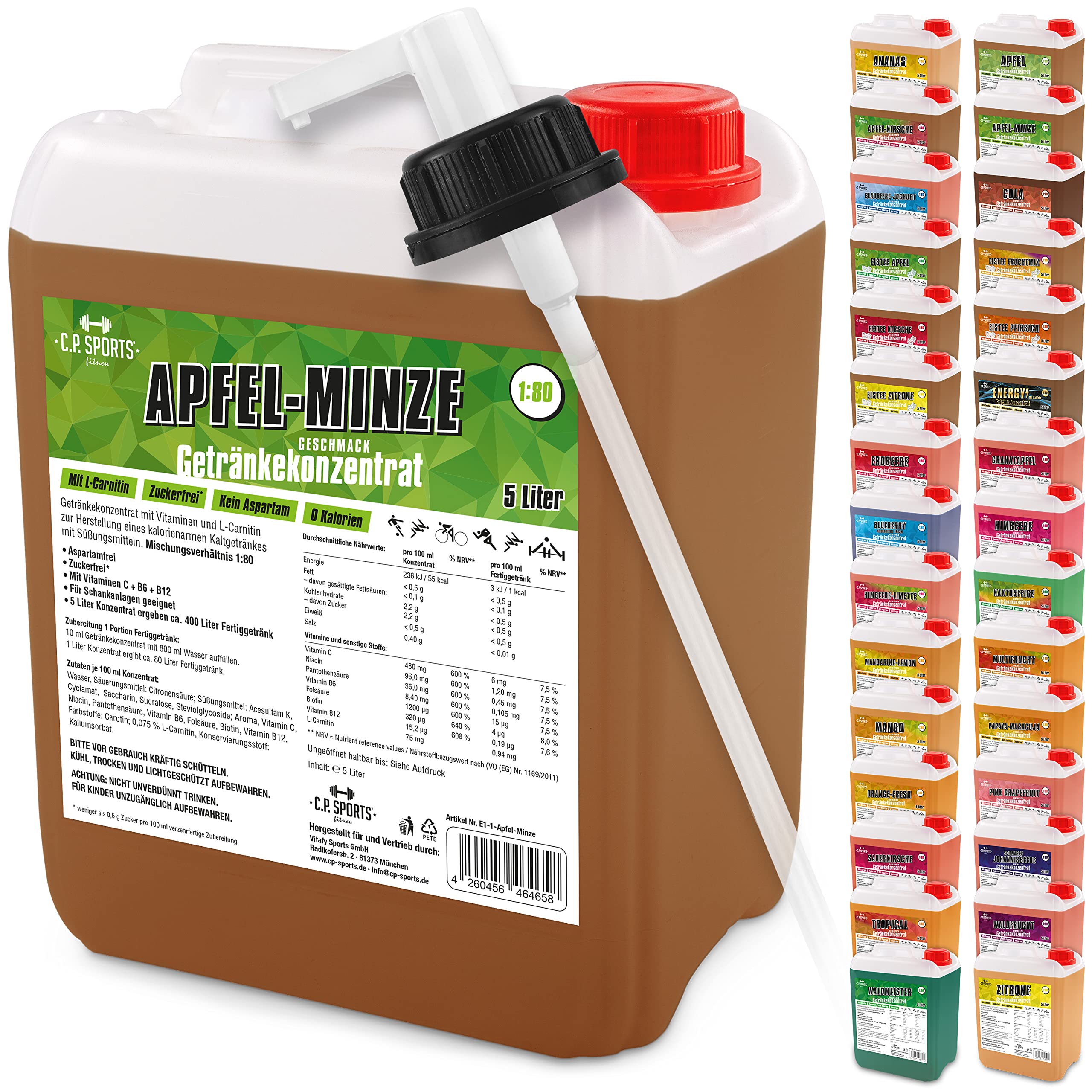 Scope of delivery: 1 canister 5 liters of beverage concentrate dosing pump-flavor: apple mint.Qualitative!C.P.Sports is the brand when it comes to everything that is essential for your training.We have an extensive range of strong products for strong people at home and abroad and are Germany's largest manufacturer and supplier of first-class cafts sports, bodybuilding and fitness equipment.Economically: particularly productive mixing ratio 1:80 (2.5 ml concentrate with 200 ml of water results in one portion - 1 liter concentrate is sufficient for approx. 80 liters of finished drink).The filling quantity of a 5 -liter canister thus results in up to 400 liters of finished drink, ideal for long and economic reach with commercial serving.PROFESSIONAL!Delivery in a 5 -liter canister, suitable for bar systems and tap systems, for example in gyms.Including a practical and easy to clean C.P.Sports dosing dispenser, for simple and accurate dosing (5ml pump stroke), with a screw cap DIN standard thread of 45mm.YUMMY!Aspartam-free and low-calorie beverage concentrate for the production of refreshment drinks for sports and leisure-sugar-free and without artificial dyes, with natural flavors, from purest spring water, with L-carnitine and various vitamins.Numerous delicious flavors from pineapple to lemon.