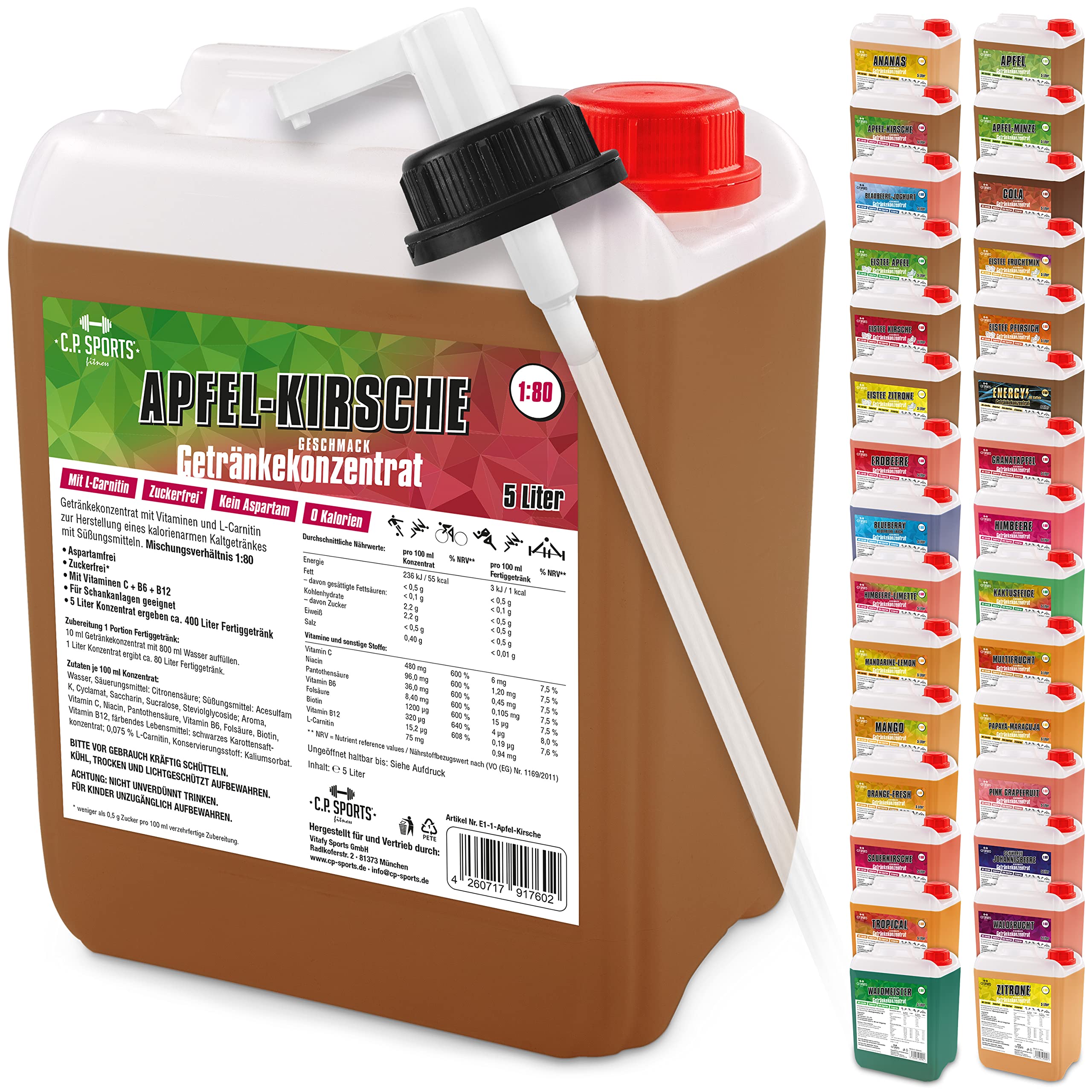 There is no way around us: For three decades, we have been the address for innovative training equipment sports accessories in Germany Europe with our know-how and our passion for weight training.Get more out of your training - with C.P.sports.Vitamin kick: Our syrup manages without aspartame artificial dyes, but it contains L-cartin, vitamins minerals.Quickly mixed : Simply fill up 2.5 ml beverage concentrate with 200ml of water enjoy sports drink before, during or after the workout.1L syrup results in 80l finished drink.Light dosage with pump dispenser.Suitable for water bubblers taverns.No Calorie, No Carb, No Sugar: free of carbohydrates, with 0 kcal and without any sugar - this makes training easier.Also ideal as a training drink for low carb nutrition.Sporty thirst quencher: The refreshing vital drink compensates for the loss of fluid in sports in a particularly fruity-delicious way.