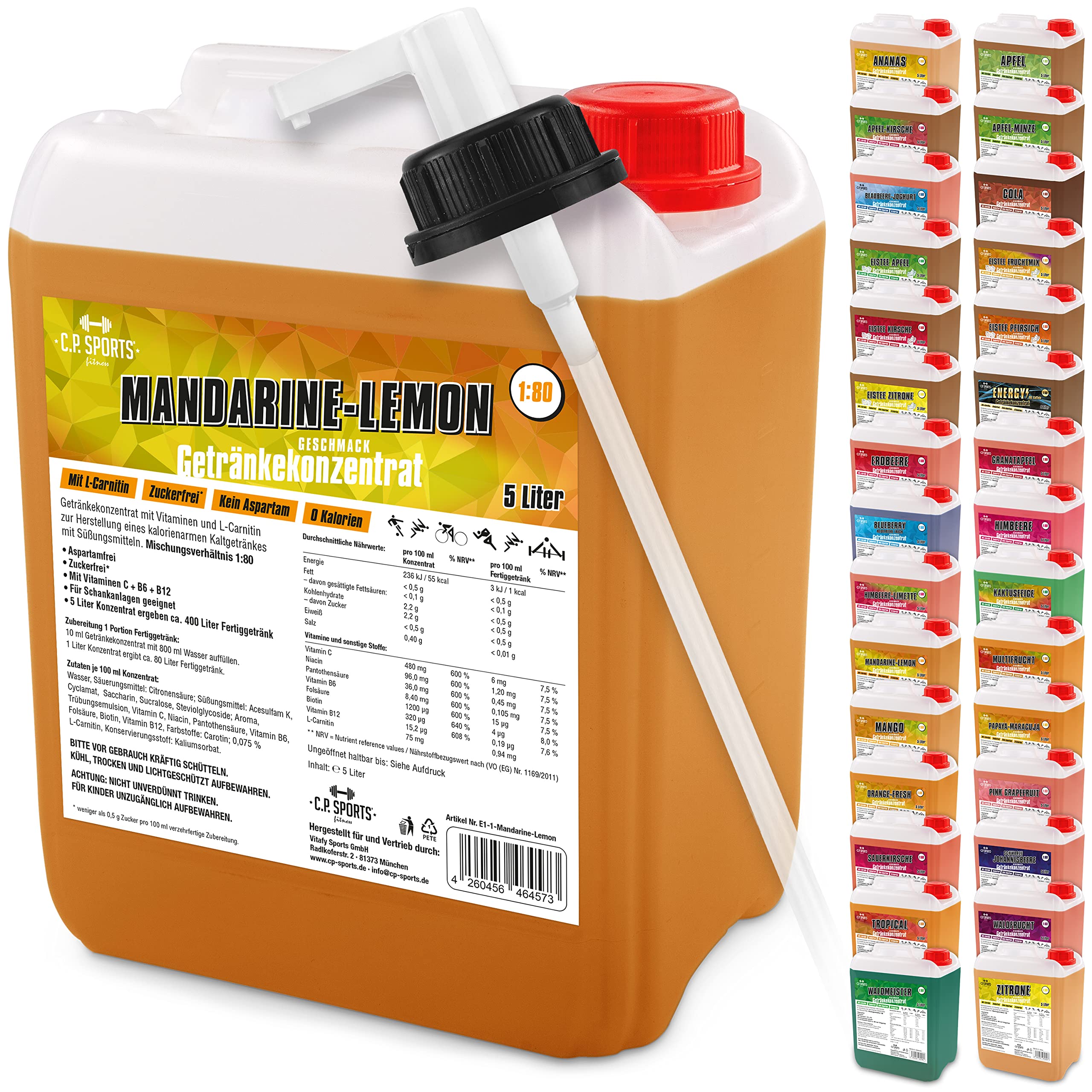 There is no way around us: For three decades, we have been the address for innovative training equipment sports accessories in Germany Europe with our know-how and our passion for weight training.Get more out of your training - with C.P.sports.Vitamin kick: Our syrup manages without aspartame artificial dyes, but it contains L-cartin, vitamins minerals.Quickly mixed : Simply fill up 2.5 ml beverage concentrate with 200ml of water enjoy sports drink before, during or after the workout.1L syrup results in 80l finished drink.Light dosage with pump dispenser.Suitable for water bubblers taverns.No Calorie, No Carb, No Sugar: free of carbohydrates, with 0 kcal and without any sugar - this makes training easier.Also ideal as a training drink for low carb nutrition.Sporty thirst quencher: The refreshing vital drink compensates for the loss of fluid in sports in a particularly fruity-delicious way.