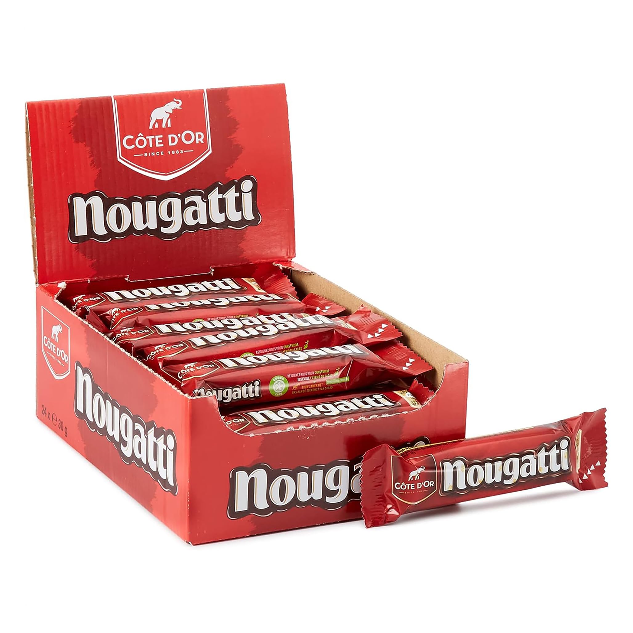 Côte d'Or Nougatti is a delicious nougat bar finely coated with a layer of tender Côte d'Or milk chocolate. Perfect for those peckish moments, this 30g Côte d'Or Nougatti bar provides a generous and indulgent mix at any time of day. Ideal for those last-minute snacks! INGREDIENTS Glucose syrup, sugar, HAZELNUTS 15 , whole MILK powder, cocoa mass, cocoa butter, palm fat, lactose (from MILK), whey powder (from MILK), whey protein (from MILK), emulsifiers (SOY lecithin, sunflower lecithin), salt, flavorings. MAY CONTAIN WHEAT, EGG, PEANUT AND OTHER NUTS DIRECTIONS FOR USE Ready to eat SAFETY WARNING Not suitable for children under 3 years Delivery contents: Pack of 24 Côte d'Or Nougatti bars, Net weight: 30 g bar. Family size of 24 bars, practical and easy to take anywhere, in your bag or to the office. Ideal for small hunger pangs at any time of the day, for your parties or to share with friends during a coffee break. 100 sustainable cocoa from the Cocoa Life program for a delicious and quality chocolate. Nougat bar finely coated with a layer of tender Côte d'Or milk chocolate. Côte d'Or Nougatti est une délicieuse barre de nougat finement nappée d'une couche de tendre chocolat au lait Côte d'Or. Parfaite pour les moments de petits creux, cette barre Côte d'Or Nougatti de 30 g assure un mix gourmand et généreux à n'importe quel moment de la journée. Idéale pour les petites faims de dernière minute ! INGRÉDIENTS Sirop de glucose, sucre, NOISETTES 15 , LAIT entier en poudre, pâte de cacao, beurre de cacao, graisse de palme, lactose (de LAIT), lactosérum en poudre (de LAIT), protéines de lactosérum (de LAIT), émulsifiants (lécithine de SOJA, lécithine de tournesol), sel, arômes. PEUT CONTENIR BLE, OEUF, ARACHIDE ET AUTRES FRUITS A COQUE MODE D'EMPLOI Prêt à manger AVERTISSEMENT DE SÛRETÉ Ne convient pas à un enfant de moins de 3 ans Contenu de la livraison : Lot de 24 barres de Nougatti Côte d'Or, Poids net : 30 g barre. Format familial de 24 barres pratiques et faciles à emporter partout, dans votre sac ou au bureau. Idéal pour les petites faims à n'importe quel moment de la journée, pour vos fêtes ou à partager entre amis lors d'une pause café. Cacao 100 durable issu du programme Cocoa Life pour un chocolat gourmand et de qualité. Barre de nougat finement nappée d'une couche de tendre chocolat au lait Côte d'Or.