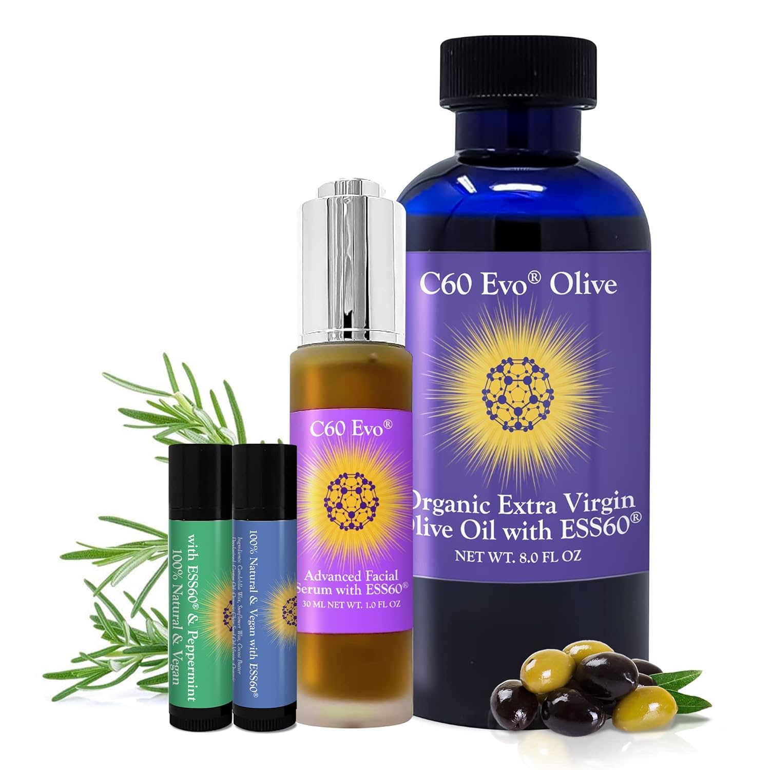 Give the Gift of Healthy Skin - Looking for a thoughtful present for a loved one? Share the joys of glowing, hydrated skin with our skin care set! Our natural lip balm, serum for face, and olive oils are ideal for all genders, ages, and skin types. Made with Vegan Ingredients - Our facial serum and lip care products not only contain pure ESS60 but also natural and vegan ingredients. This specially formulated blend helps the skin soften and heal. Unlock the potential of a true miracle molecule with our C60 EVO supplement and skin care products. Restores Your Youthful Glow - Be confident in your skin with C60 Evo's natural face and lip care products. Our C60 olive oil and hydrating serum helps reduce fine lines, swelling, and cellular damage, so you can easily beat the signs of advancing years. Nourishing and Hydrating - Get a daily dose of hydration with our rosemary scented facial serum and lip renewal set. Your skin will enjoy the excellent pampering, resulting in soft and dewy freshness on your face and lips. Complete Face Care Set - Achieve your skin goals with our antioxidant-rich skin care set. It consists of 1 bottle of ESS60 and edible extra virgin olive oil, 1 bottle of advanced facial serum, and 2 lip renewal balms, all infused with pure ESS60. Get glowing and moisturized skin and lips easily with this set.