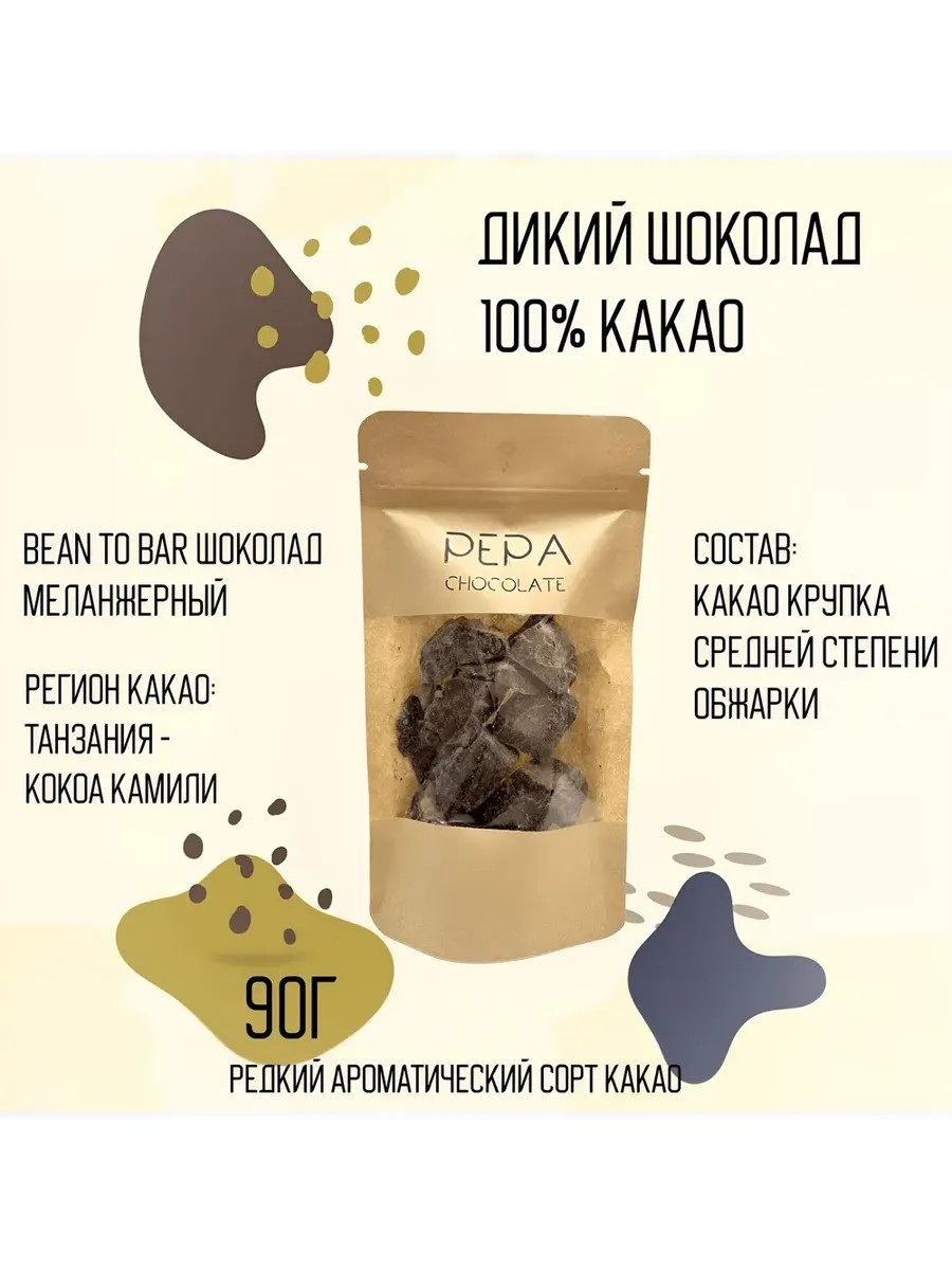 Дикий шоколад 100%, серия origin (не темперированный шоколад) - шоколад, который после перетирания на каменных жерновах 72 часа, не подвергается дополнительной обработке (темперированию). Благодаря чему, после месячного вызревания шоколад приобретает необычную структуру, менее плотную, в сравнении с темперированным, легко крошащуюся и тающую на языке. Шоколад изготовлен по технологии bean-to-bar из ароматических какао-бобов, из Танзании редкого сорта. Такой шоколад отлично плавится на водяной бане - употреблять можно его в чистом виде, приготовить из него домашний шоколад, конфеты, горячий шоколад, фондю, использовать его как добавку в мороженое, каши, различные десерты.
