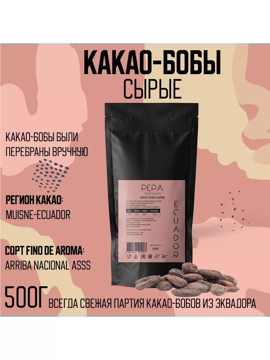 Cacao Pepa de Oro Какао-бобы сырые отборные Arriba Nacional Эквадор, 500г