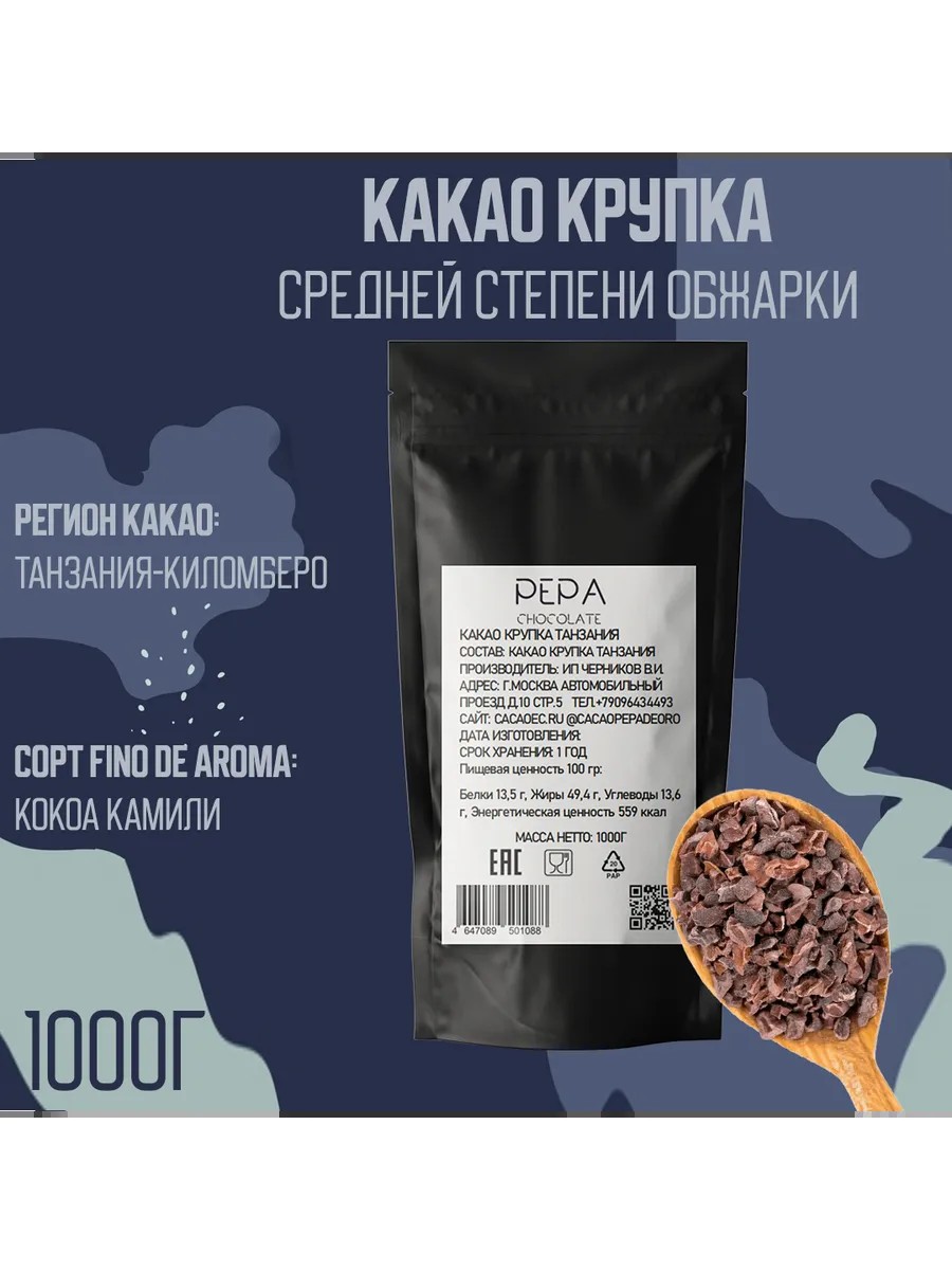 Cacao Pepa de Oro Какао крупка средней обжарки Танзания Organic 1000г