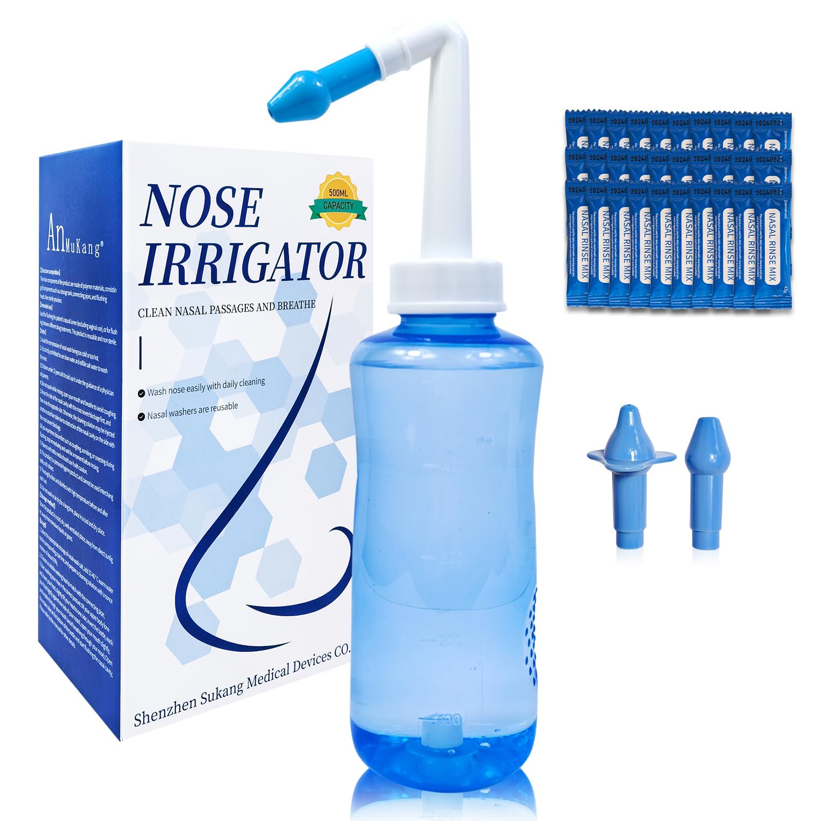 500ml Large Capacity for Home Travel : Eliminate mid-rinse refills with a spacious 300ml design. Lightweight and portable, it's ideal for allergy sufferers, cold recovery, or maintaining nasal health on the go. 30 Pre-Measured Saline Packets Included: Each packet mixes perfectly with 500ml of water to create an isotonic solution, effectively flushing out dust, mucus, and allergens for daily sinus relief and nasal hygiene. BPA-Free Durable Construction: Made from food-grade, odorless polypropylene (PP), this nasal rinse bottle is safe for long-term use, gentle on sensitive nasal passages, and requires no batteries for energy-efficient operation. Anti-Backflow Technology for Enhanced Hygiene: The built-in one-way valve prevents contaminated water from flowing back into the bottle, ensuring a hygienic rinse every time—perfect for users prone to sinus infections or allergies. Gentle Valve-Controlled Nasal Irrigation System: Designed with an innovative air-pressure valve system, this sinus rinse bottle ensures a steady, controlled flow of water without manual squeezing, making it ideal for beginners, adults, and kids seeking a comfortable nasal care experience.