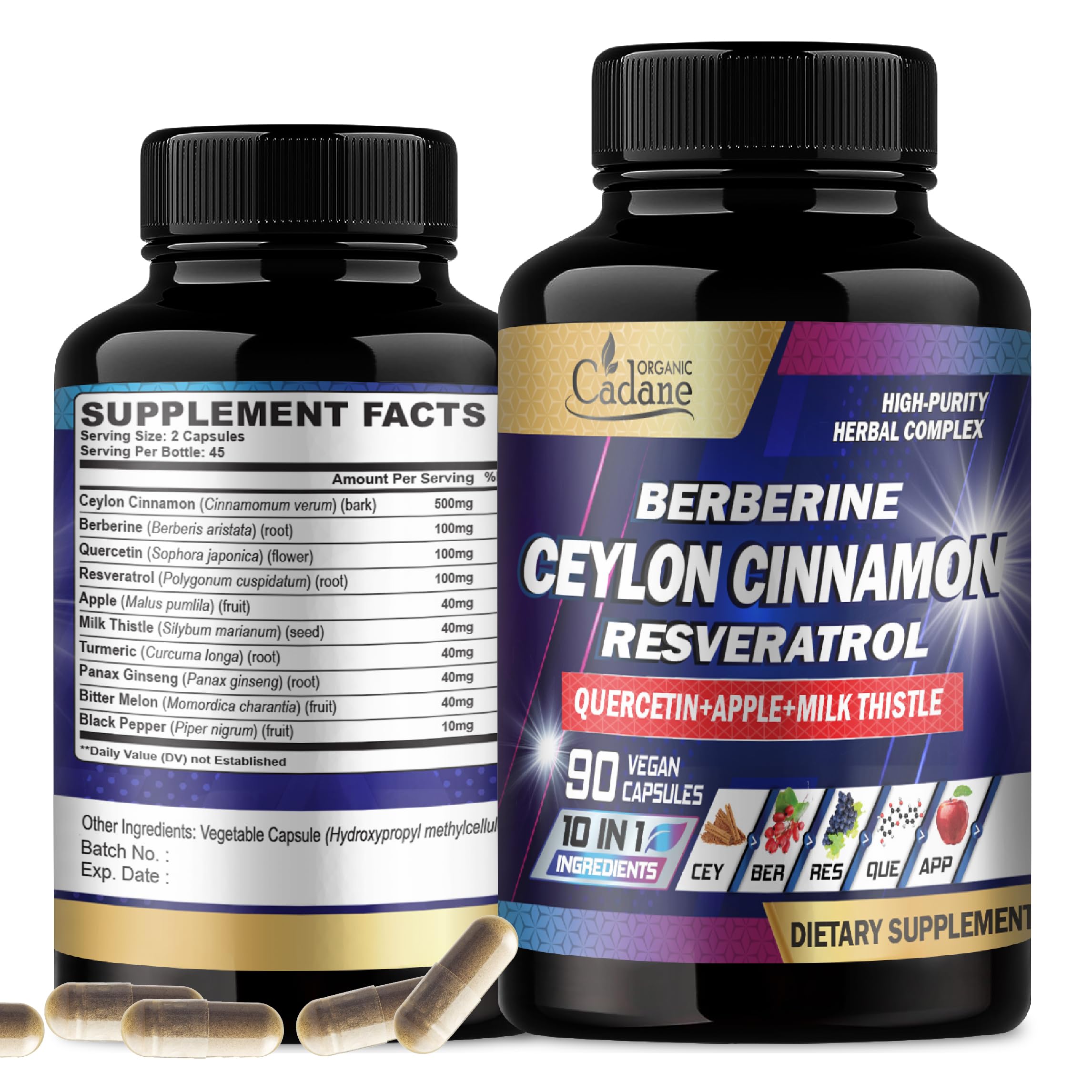 Cadane Ceylon Cinnamon Berberine Quercetin Supplement - Support Heart Body Digestive & Immunity - 10in1 with Milk Thistle Turmeric Apple & More - 90 Veggie Capsules