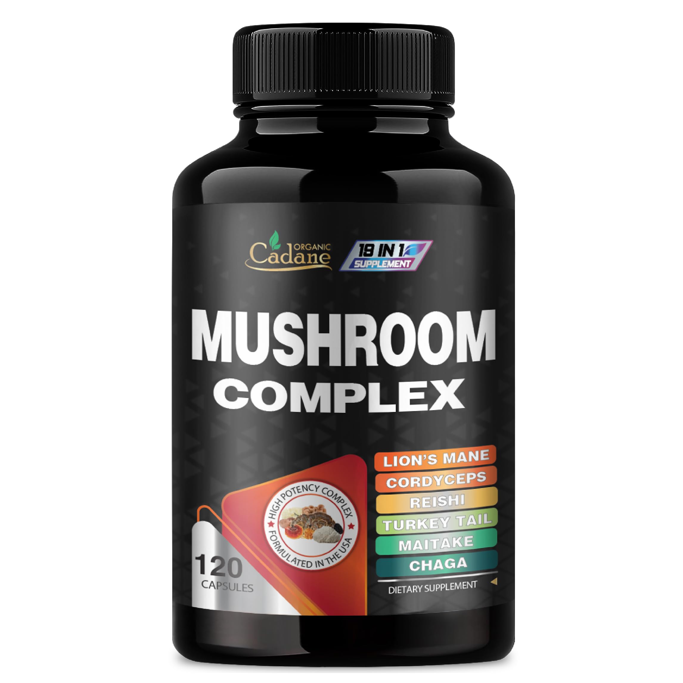 Cadane Mushroom Complex Supplements - 19in1 Concentrated with Lions Mane Cordyceps Sinensis Reishi Turkey Tail Mushroom Maitake Chaga Shiitake Enoki Agaricus and More - 120 Vegan Capsules