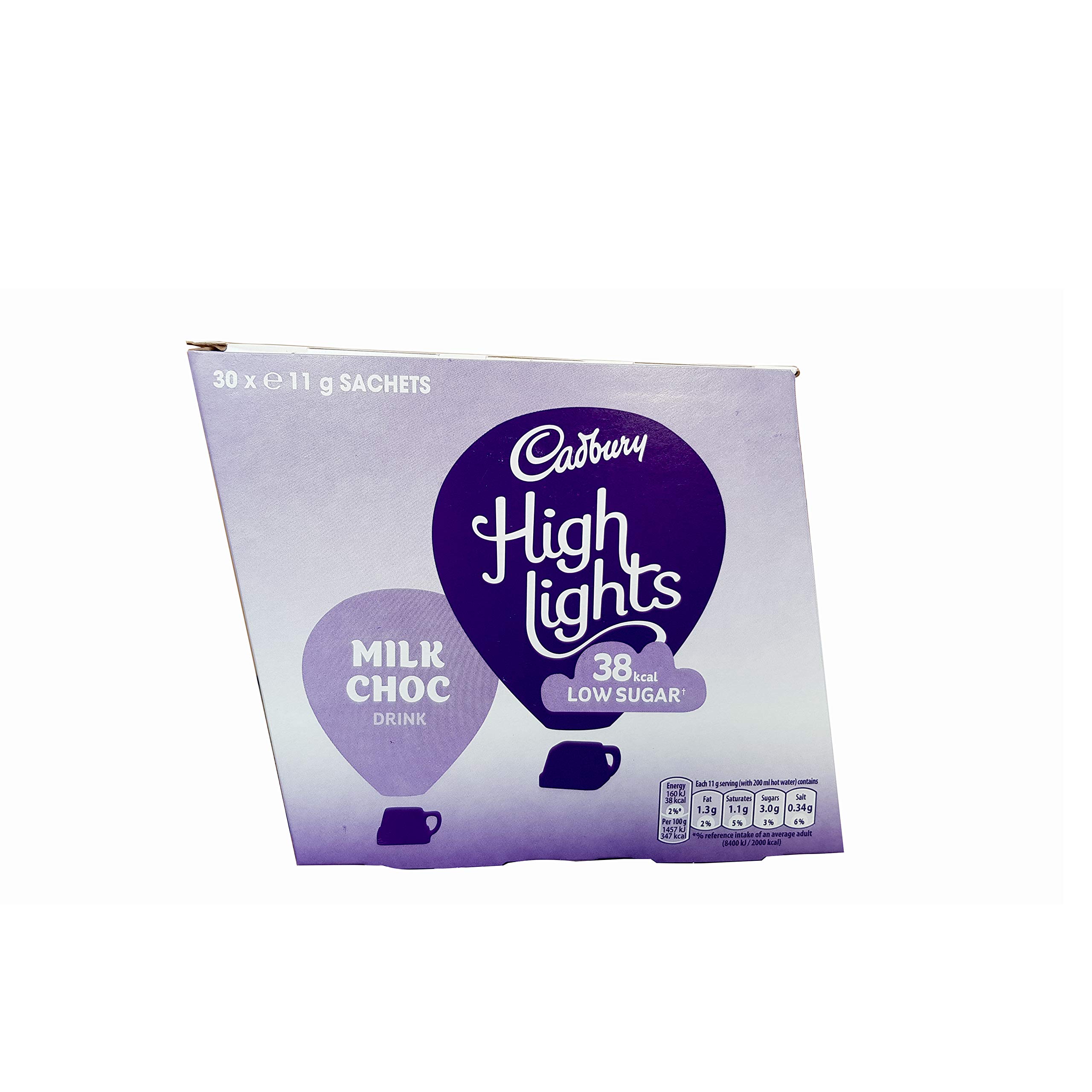 A lighter hot chocolate with all the taste of Cadbury milk chocolate. A low-calorie hot chocolate, with only 40 calories and less than 1 fat per serving. Convenient 11g sachet, ideal for the office, home, or on the go. Stir in hot water. Suitable for vegetarians. Per cup: 161kJ, 38kcal. May only contribute to weight loss as part of a calorie-controlled diet and healthy lifestyle. INGREDIENTS Fat-reduced cocoa powder (24 ), whey powder (from milk), skimmed milk, inulin, milk chocolate (6 ) [milk, sugar, cocoa mass, cocoa butter, vegetable oils (palm and shea in various proportions), emulsifiers (E442, sunflower lecithin), flavorings, glucose syrup, palm oil, thickener (carrageenan), salt, flavorings, milk proteins, anti-caking agent (E551), sweeteners (aspartame, acesulfame K), emulsifier (E471), cocoa, sugar: traded in accordance with Fairtrade Standards, total 26 , contains a source of phenylalanine] DIRECTIONS FOR USE Instructions (with 200ml of hot water): For the perfect Cadbury Highlights, empty one sachet of Cadbury Highlights into a mug or cup, add hot water and Stir well. See moreCadbury Highlights Chocolat chaud au lait 11 g Boîte de 30DESCRIPTION DU PRODUIT DESCRIPTION DU PRODUIT Un chocolat chaud plus léger avec tout le goût du chocolat au lait Cadbury. Un chocolat chaud à faible teneur en calories, avec seulement 40 calories et moins de 1 de matières grasses par portion. Sachet pratique de 11 g idéal pour le bureau, à la maison ou emporter avec vous lors de vos voyages. Incorporer l'eau chaude. Convient aux végétariens. Par tasse 161kJ 38 kcal Peut seulement aider à amincir dans le cadre d'un régime contrôlé en calories et d'un mode de vie sain. INGRÉDIENTS Poudre de cacao réduite en graisse (24 ), poudre de lactosérum (à partir de lait), lait écrémé, inuline, chocolat au lait (6 ) [lait, sucre, masse de cacao, beurre de cacao, huiles végétales (palme et karité dans diverses proportions), émulsifiants (E442, lécithine de tournesol), arômes, sirop de glucose, huile de palme, épaississant (Carraghénane ), sel, arômes, protéines de lait, agent anti-agglomérant (E551), édulcorants (aspartame, acésulfame K), émulsifiant (E471), cacao, sucre : commercialisé en conformité avec les normes du commerce équitable, total 26 , contient une source de phénylalanine MODE D'EMPLOI Instructions (avec 200 ml d'eau chaude) : pour le parfait Cadbury Highlights videz un sachet de Cadbury Highlights dans une tasse ou une tasse, ajoutez de l'eau chaude et remuez bien. Voir plus