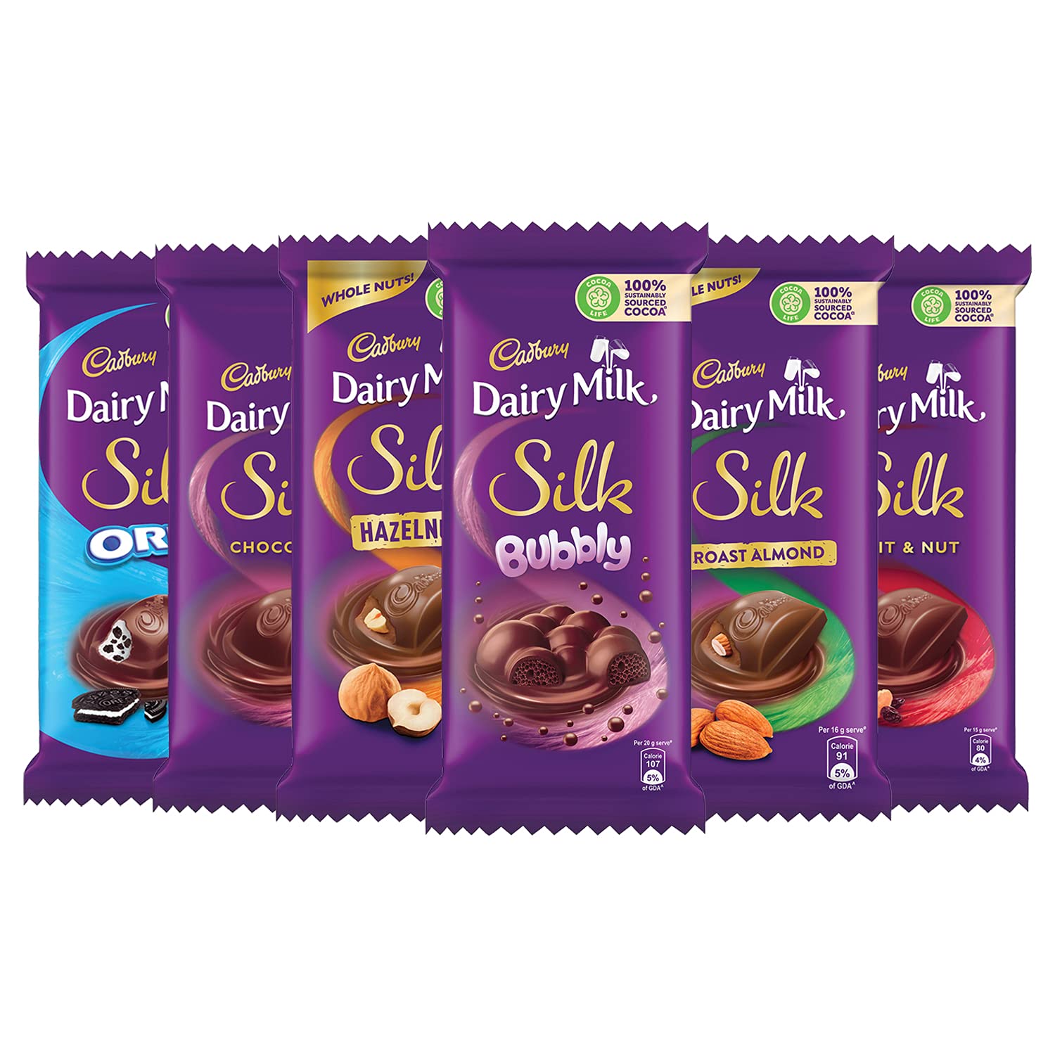 Cadbury Dairy Milk Silk is all about indulging in the rich, smooth texture of chocolate. It gives you a reason to celebrate every happy occasion, big or small. In short, indulge in a rich, sweet, and creamy treat. This combo includes 1 pack of Cadbury Dairy Milk Silk 150g, 1 pack of Cadbury Dairy Milk Silk Oreo 130g, 1 pack of Cadbury Dairy Milk Silk Bubbly 120g, 1 pack of Cadbury Dairy Milk Silk Roast Almond 137g, 1 pack of Cadbury Dairy Milk Fruit and Nut 137g, and 1 pack of Cadbury Dairy Milk Silk Hazelnut 143g.