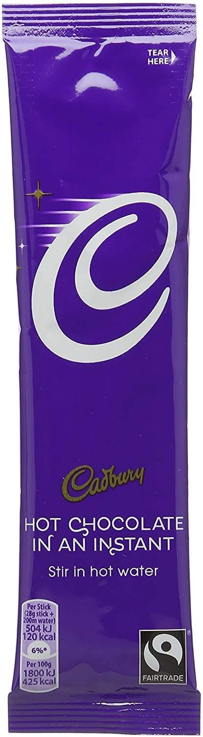 Delicious Cadbury Hot Chocolate Sachets, 12-Pack A more convenient version of your favorite Cadbury hot chocolate. Simply add water for the smooth, creamy taste of Cadbury hot chocolate. This handy 28g sachet of Cadbury instant hot chocolate is Fairtrade certified. Suitable for vegetarians. Sugar, Cocoa Powder 13 , Whey Powder (from milk), Glucose Syrup, Skimmed Milk Powder, Coconut Fat, Milk Chocolate 4 [Whole Milk Powder, Sugar, Cocoa Mass, Cocoa Butter, Vegetable Fats (Palm and Shea in various proportions), Emulsifiers (E4442, Sunflower Lecithin), Flavorings), Palm Lecithin), Flavorings), Fat), Milk Proteins, Anti-Caking Agent (E551), Flavorings, Emulsifier (E471), Stabilizer (E339), Sugar, Cocoa: Fairtrade certified, total 56.5 INSTRUCTIONS FOR USE Simply stir in hot waterCadbury Lot de 12 bâtons de chocolat chaud instantané 28 gDESCRIPTION DU PRODUIT DESCRIPTION DU PRODUIT Delicious Cadbury Lot de 12 sachets de chocolat chaud Une version plus pratique de votre chocolat chaud Cadbury préféré. Ajoutez simplement de l'eau pour le goût doux et crémeux du chocolat chaud Cadbury. Ce sachet pratique de 28 g de chocolat chaud instantané Cadbury est certifié Fairtrade. Convient aux végétariens. Sucre, Poudre de cacao 13 , Poudre de lactosérum (à partir de lait), Sirop de glucose, Lait écrémé en poudre, Graisse de noix de coco, Chocolat au lait 4 [Lait entier en poudre, Sucre, Masse de cacao, Beurre de cacao, Graisses végétales (palme et karité dans diverses proportions), Émulsifiants (E4442, lécithine de tournesol), Saveurs), Élithine de palmierne), Saveurs), Graisse ), Protéines de lait, Anti- Agent de Caking (E551), Arômes, Emulsifiant (E471), Stabilisateur (E339), Sucre, Cacao: Échangé conformément aux normes Fairtrade, total 56,5 MODE D'EMPLOI Il suffit de remuer dans de l'eau chaude