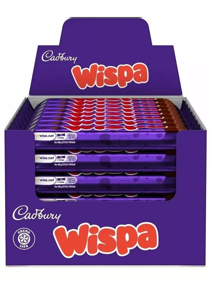Виспа батончик. Wispa - популярный шоколадный батончик, известный жителям России еще с 90-х годов и полюбившийся пористой, воздушной текстурой. Мелкие пузырьки правильной округлой формы, насыщают начинку из трюфельного шоколада нежностью, являясь дополнительным неосязаемым ингредиентом. Батончик облит молочным шоколадом Wispa безупречного качества, с практически полным отсутствием растительных жиров, традиционно имеющий привкус жирных коровьих сливок.