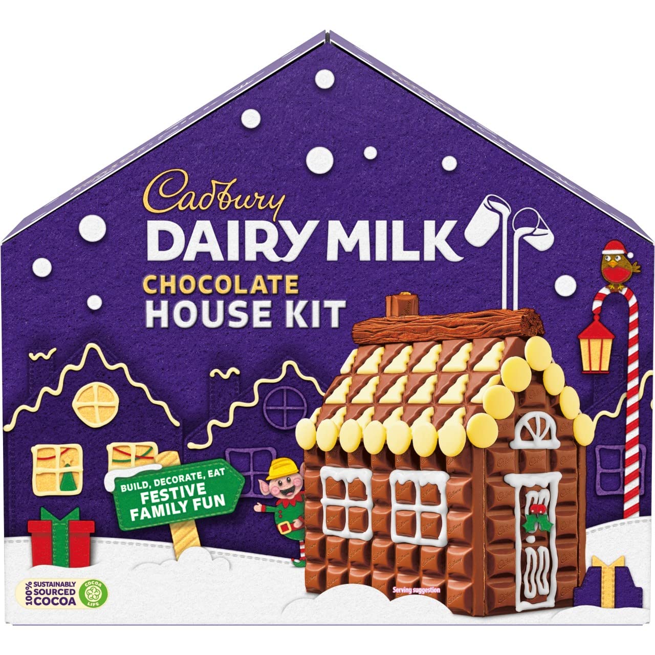 : Cadbury Chocolate House Kit for Dairy Milk 840g. Get creative this festive season with the Cadbury Chocolate House Kit. Build your perfect chocolate design and then enjoy it! Contains delicious Cadbury Dairy Milk and white chocolate. Build, decorate, eat – festive family fun. Great to do with the whole family at Christmas. Ingredients: Milk, sugar, cocoa butter, cocoa mass, vegetable fats (palm, shea), skimmed milk powder, wheat flour, whey powder (from milk), reduced cocoa powder, emulsifiers (E442, soy lecithins, E476), salted butter, milk fat, invert sugar syrup, ground mixed spices (ginger, herbs, cinnamon), acidity regulator (potassium carbonates), raising agent (sodium carbonates), flavorings. Milk chocolate: solids 20 minimum, 23 actual, cocoa solids 20 minimum. The equivalent of 426 ml of fresh liquid milk in every 227 g of milk chocolate. Milk chocolate: solids 14 minimum, cocoa solids 25 minimum. Contains vegetable fats in addition to cocoa butter. May contain nuts.