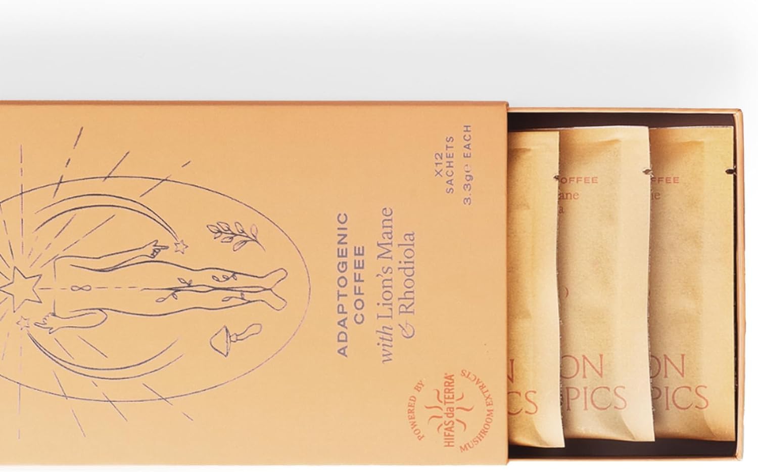 : Adaptogenic coffee with Lion's Mane Mushroom and Rhodiola. With 466 mg of premium organic Lion's Mane Mushroom. This mushroom coffee blend helps you discover motivation, mental clarity, and focus. Excellent for short- and long-term memory, brain fog, and reducing procrastination. No artificial preservatives or sweeteners. Pure, natural ingredients. Box of 12 sachets. Ingredients: Barista-style coffee, organic Lion's Mane Mushroom extract, Rhodiola rosea extract, natural flavor. Directions: 1. Empty the contents of one sachet into a cup. 2. Add hot water. 3. Stir well. 4. Add sweeteners or milk, if desired. See moreNo artificial preservatives or sweeteners. Pure, natural ingredients. Excellent for short- and long-term memory, brain fog, and reducing procrastination. Discover motivation, mental clarity, and focus. With Rhodiola, a powerful adaptogen known for its effects on stress levels and brain function. Adaptogenic coffee with 466 mg of premium, double-extracted, organic Lion's Mane Mushroom.Description du produit Café adaptogène au champignon crinière de lion et rhodiola. Avec 466 mg de champignon crinière de lion bio de qualité supérieure. Ce mélange de café aux champignons vous aide à découvrir la motivation, la clarté mentale et la concentration. Excellent pour la mémoire à court et à long terme, le brouillard cérébral et la réduction de la procrastination. Sans conservateurs ni édulcorants artificiels. Ingrédients naturels purs. Boîte de 12 sachets. Ingrédients Café de style barista, extrait de champignon crinière de lion bio, extrait de rhodiola rosea, arôme naturel. P.when('A').execute(function(A) { A.on('a:expander:toggle_description:toggle:collapse', function(data) { window.scroll(0, data.expander. expander[0].offsetTop-100) }) }) Mode d'emploi 1. Videz le contenu d'un sachet dans une tasse. 2. Ajouter de l'eau chaude. 3. Bien mélanger. 4. Ajoutez des édulcorants ou du lait, si vous le souhaitez. Voir plusSans conservateurs ni édulcorants artificiels. Ingrédients naturels purs. Excellent pour la mémoire à court et à long terme, le brouillard cérébral et la réduction de la procrastination. Découvrez la motivation, la clarté mentale et la concentration. Avec Rhodiola, un puissant adaptogène connu pour ses effets sur les niveaux de stress et le fonctionnement du cerveau. Café adaptogène avec 466 mg de champignon crinière de lion biologique de qualité supérieure à double extraction.Café aux champignons London Nootropics Flow Café adaptogène à l'hydne hérisson et à l'orpin rose 12 sachets
