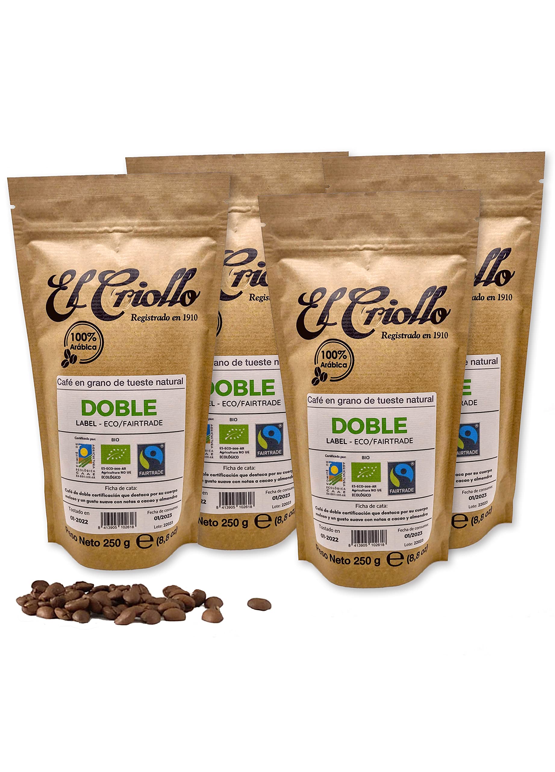 Café Biologique et Equitable EN GRAINS 'Double Label' - Cafés El Criollo 100 Arabica et torréfié naturellement Sceau du commerce équitable Paquet de 4x250gr. (1 KG)