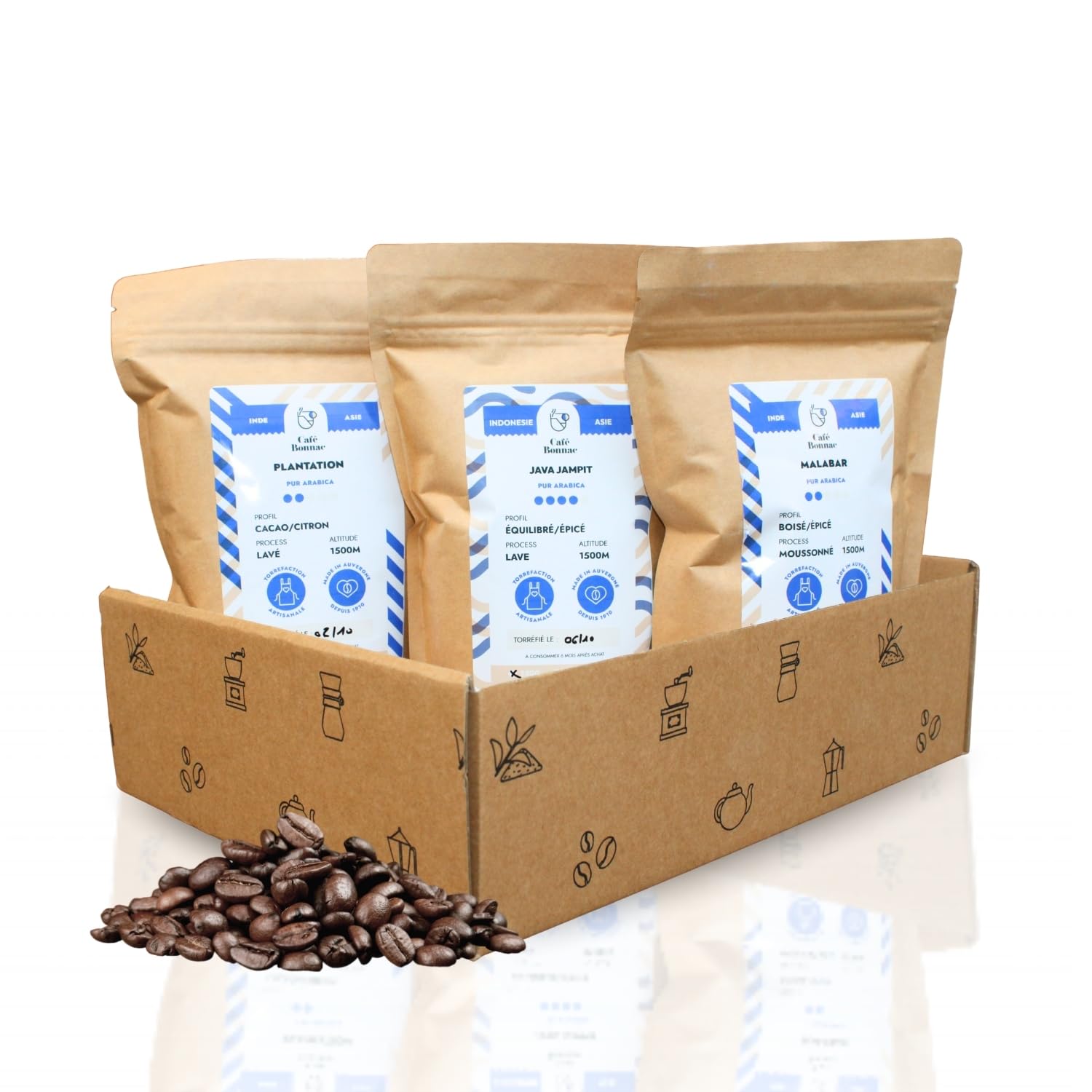 Café Bonnac – Coffret Découverte Cafés d'Asie – Café en Grain – 3x250g – 100 Arabica – Inde Malabar, Inde Plantation Indonésie Java – Torréfaction Artisanale Française – Idée Cadeau