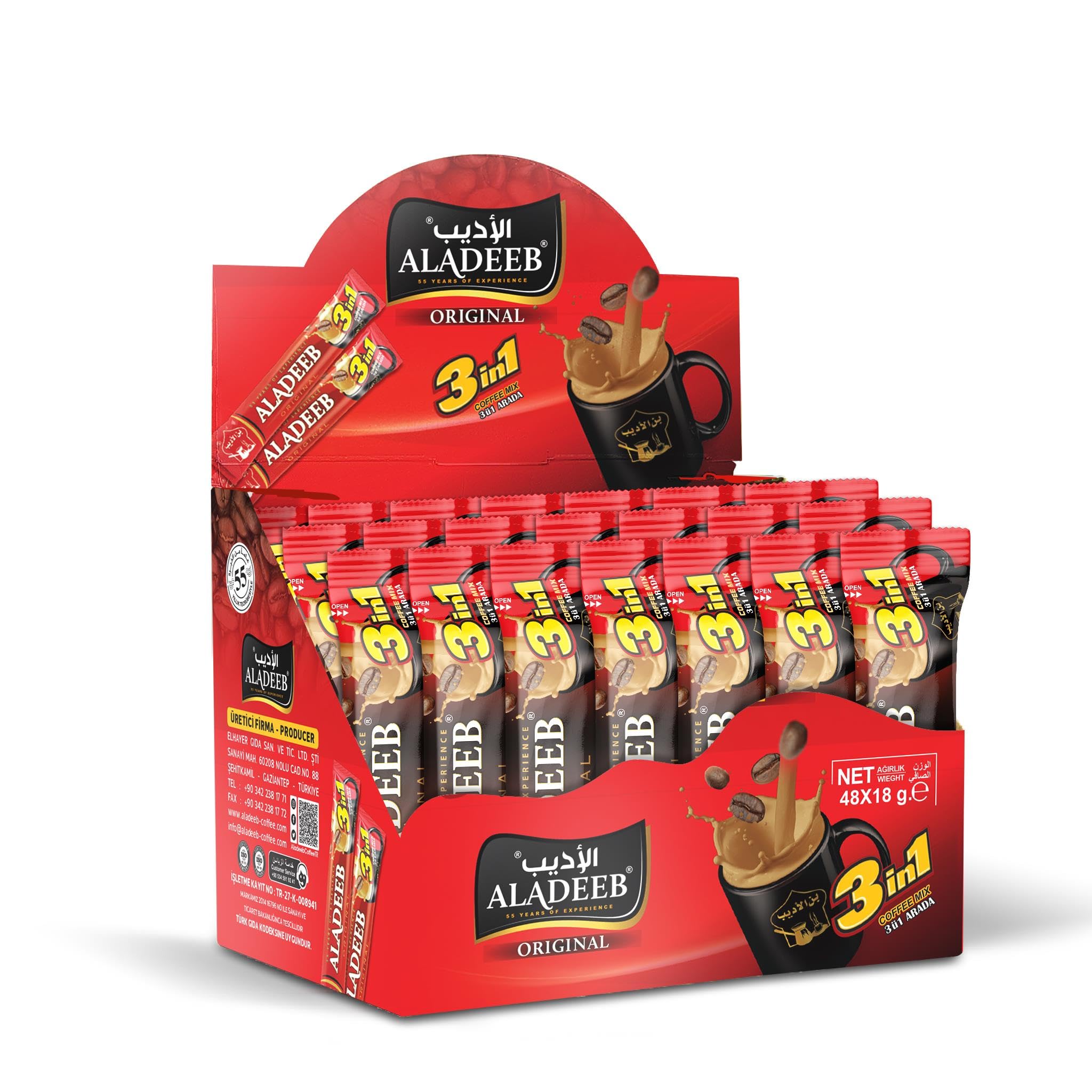 ALADEEB 3-in-1 Original Instant Coffee offers the perfect coffee experience on the go, at the office, or at home. This convenient 3-in-1 blend combines instant coffee, sugar, and creamer in the ideal composition for a balanced and creamy taste. Each box contains 24 individual 18g sachets, allowing for quick and easy preparation. Simply add hot water, stir, and enjoy—no extra ingredients or complicated preparation required. The individually wrapped sticks are perfectly portioned and stay fresh for longer. Ideal for everyday coffee, meetings, travel, or when unexpected guests arrive. With ALADEEB, you enjoy the authentic taste of coffee in its most convenient form.Convenient portions: 24 individual 18g sticks allow for quick preparation without measuring—ideal for the office, home, or on the go. Easy preparation: simply pour a stick into a cup, add hot water, stir, and enjoy—ready in seconds. Large size: with 24 servings, this supply pack provides sustainable coffee, perfect for families, offices, or regular coffee lovers. Nutritional information: each 18g serving contains 69.5 kcal, 0.95g of protein, 16.11g of carbohydrates, and provides 17 of the daily requirement for calcium and 11 for potassium."Le café instantané ALADEEB 3-en-1 Original vous offre le plaisir parfait du café à emporter, au bureau ou à la maison. Ce mélange pratique 3-en-1 combine café soluble, sucre et crème dans la composition idéale pour un goût équilibré et crémeux. Chaque boîte contient 24 sachets individuels de 18 g, permettant une préparation rapide et facile. Il suffit d'ajouter de l'eau chaude, de remuer et de déguster — sans ingrédients supplémentaires ni préparation compliquée. Les sticks emballés individuellement sont parfaitement dosés et conservent leur fraîcheur longtemps. Idéal pour le café quotidien, les réunions, les voyages ou lorsque des invités arrivent à l'improviste. Avec ALADEEB, vous profitez d'un goût de café authentique sous sa forme la plus pratique.Portions pratiques : 24 sticks individuels de 18 g permettent une préparation rapide sans mesure — idéal pour le bureau, la maison ou en déplacement. Préparation facile : il suffit de verser un stick dans une tasse, d'ajouter de l'eau chaude, de remuer et de déguster — prêt en quelques secondes. Grand format : avec 24 portions, ce pack d'approvisionnement offre un café durable, parfait pour les familles, bureaux ou amateurs de café réguliers. Valeurs nutritionnelles : chaque portion de 18 g contient 69,5 kcal, 0,95 g de protéines, 16,11 g de glucides et fournit 17 des besoins quotidiens en calcium et 11 en potassium.".Café instantané ALADEEB 3-en-1 Original, 24 sachets × 18 g.