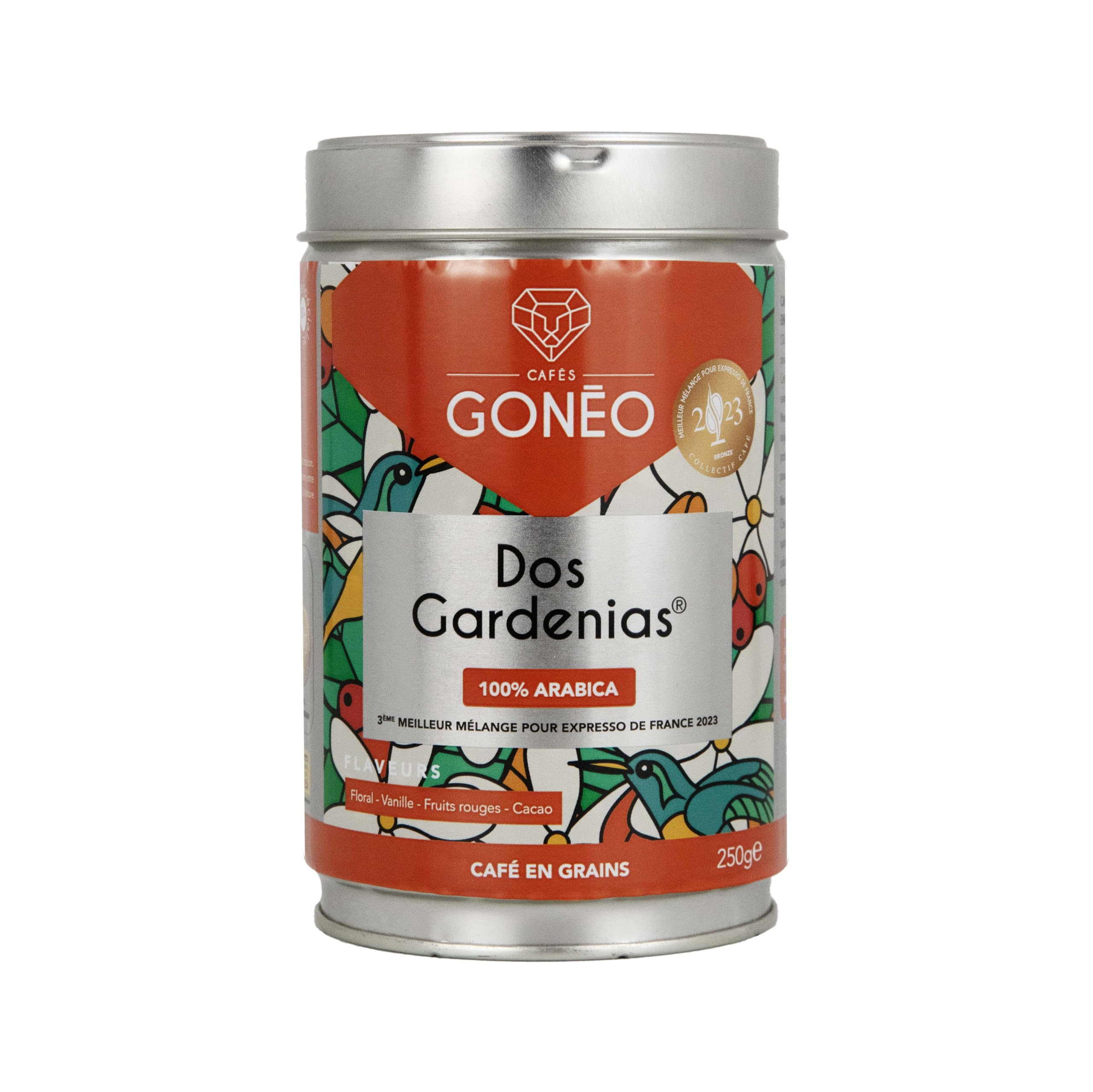 CAFÉS GONÉO - Café En Grains - Dos Gardenias - 100 Arabica - Blend Primé Paris Coffee Show 2023 - Notes Florales, Vanille Fruits Gourmands - Explosif et original - 250 g