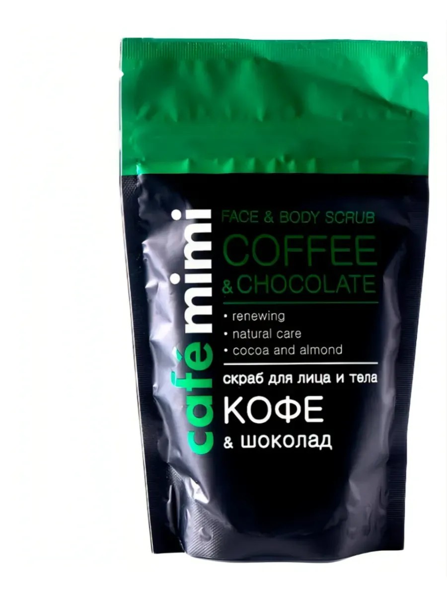 Cafe mimi скраб для тела Кофе и Шоколад 150г. А ты уже попробовала кофейно-шоколадный скраб от Cafe Mimi? Скраб на основе натурального молотого кофе, какао и тростникового сахара бережно отшелушивает и очищает кожу, восстанавливает эластичность и тонус, придает ей упругость и гладкость, оставляя на теле восхитительный аромат шоколада. Масло Какао и сладкого Миндаля способствуют омоложению кожи, питают и увлажняют, насыщают ее витаминами и микроэлементами.