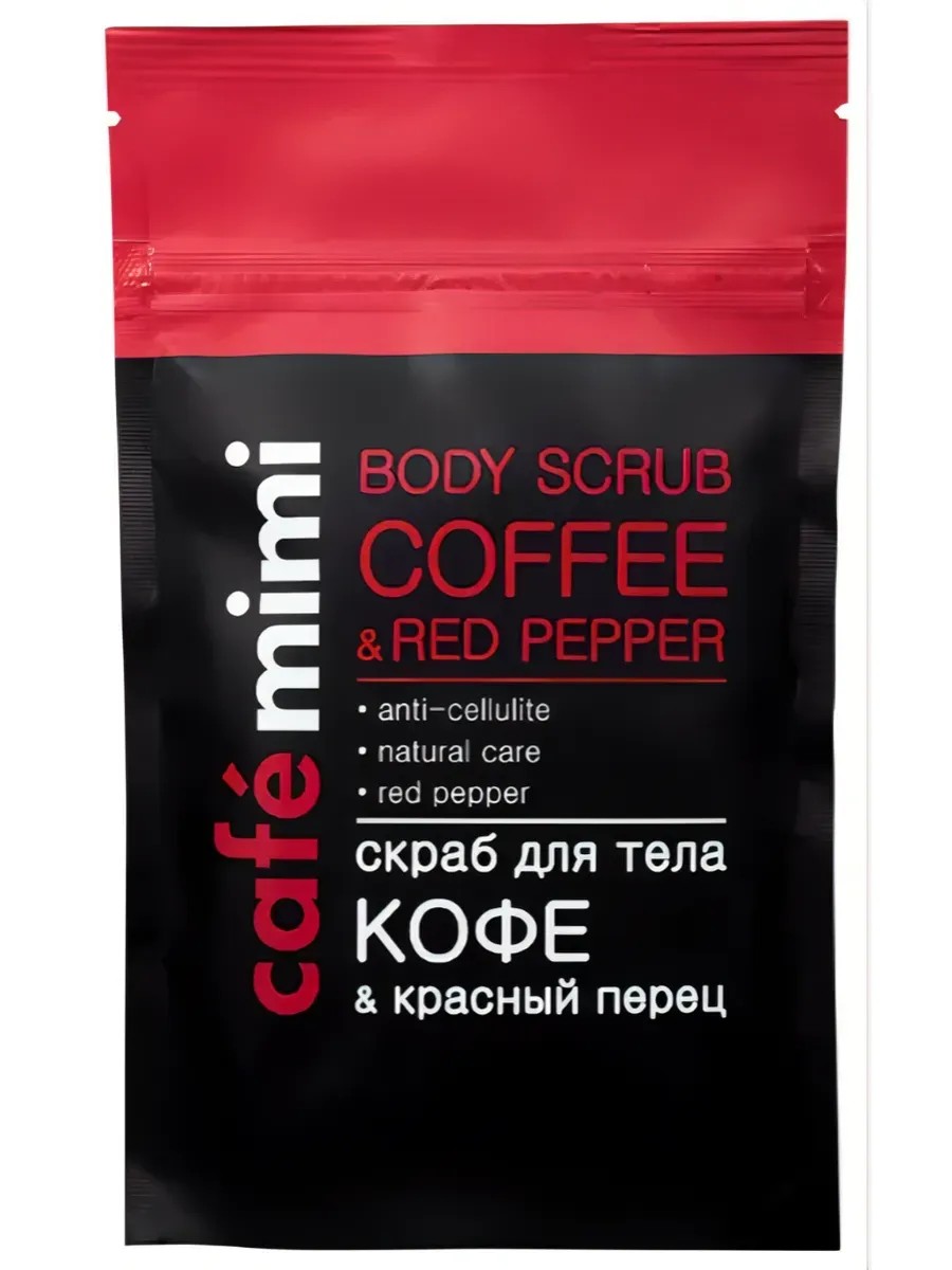 Cafe mimi скраб для тела Кофе и красный перец 150г. Скраб на основе натурального молотого кофе, морской соли и экстракта красного перца бережно отшелушивает и очищает кожу, оказывает разогревающий эффект, помогает предотвратить появление целлюлита, заметно улучшает общее состояние кожи.