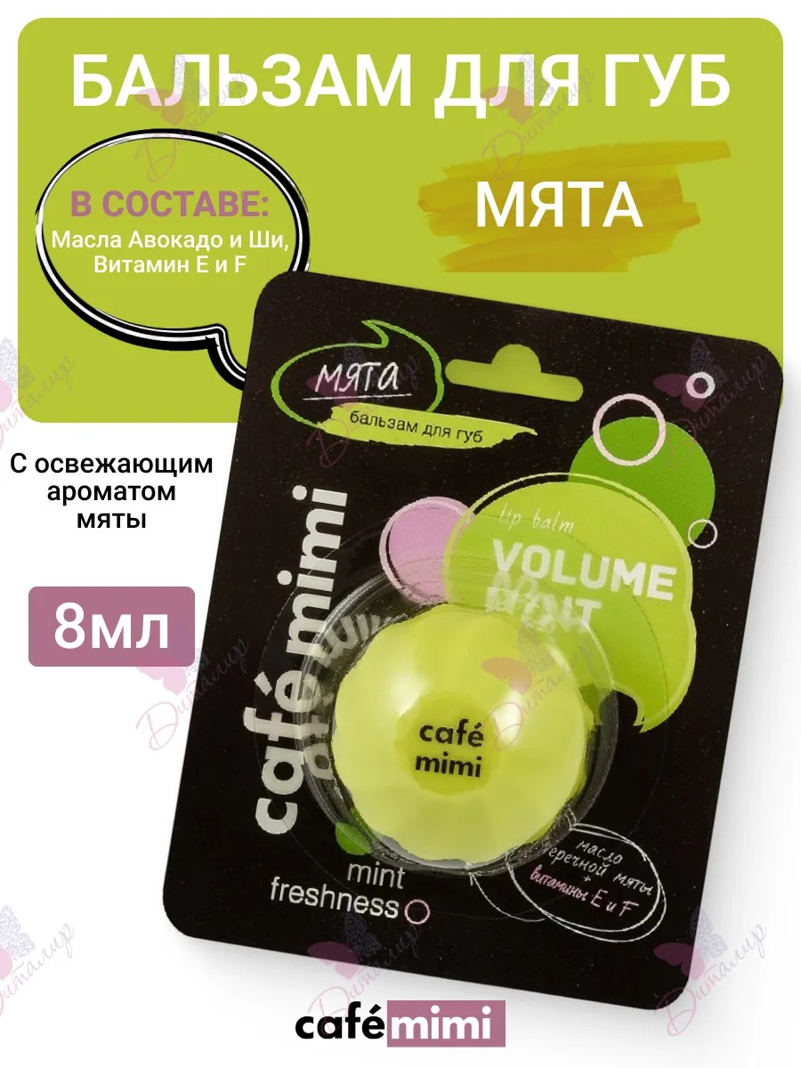 CAFE MIMI lip balm with a refreshing mint aroma has a toning and cooling effect. It intensely moisturizes, nourishes, and restores the skin of the lips thanks to shea and avocado butters, vitamins E and F. Apply to lips as needed. For external use only.