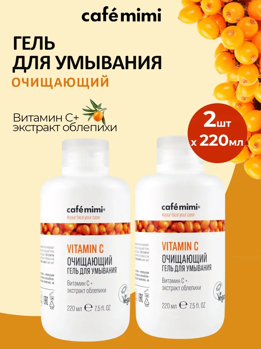 Гель для умывания очищающий 220мл, 2шт. Новая линейка cafе mimi - это несколько серий уходовых средств разработанных под каждый тип кожи, получившие сертификацию Vegan. Витаминный гель для умывания деликатно очищает кожу, выравнивает ее тон и придает здоровое сияние. Витамин С - мощный антиоксидант, защищает кожу от неблагоприятного воздействия окружающей среды. Экстракты лимона и облепихи интенсивно увлажняют, проникая в глубокие слои кожи, запускают процесс регенерации клеток. Масло манго смягчает кожу и устраняет шелушения.Серия средств с витамином С разработана специально для оказания помощи кожи при первых возрастных изменениях, для защиты от воздействия солнечных лучей, а также в борьбе с пигментными пятнами, шелушениями и покраснениями на коже.Мощный заряд витаминов и антиоксидантов в комбинации с деликатным отшелушивающим эффектом кислот, преображает кожу лица, делает ее невероятно гладкой и отдохнувшей.