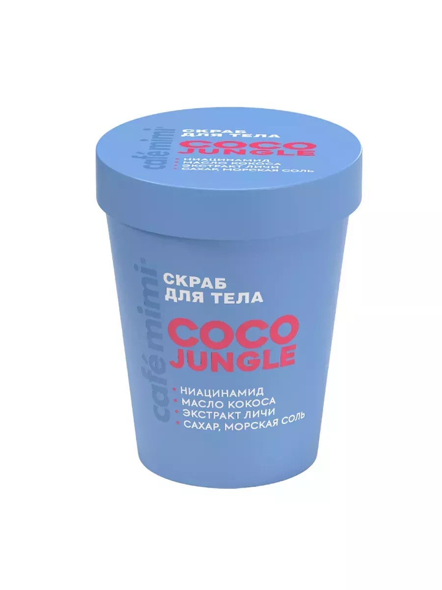 Cafemimi Colours Скраб для тела Coco Jungle, 250 г, 1 штука. Инновационные формулы на основе трендовых и функциональных ингредиентов, натуральных экстрактов и масел, в сочетании с вдохновляющими ароматами эффективно ухаживают за кожей и волосами. Создавай свои правила. Сочетай и экспериментируй.Ниацинамид стимулирует выработку коллагена и эластина, борется с целлюлитом. Масло кокоса интенсивно увлажняет, смягчает и питает кожу, устраняет сухость и стянутость. Экстракт личи насыщает кожу витаминами, повышает тонус и упругость. Состав: Sea Salt (морская соль), Glycerin (растительного происхождения), Sucrose (сахар), Aqua, Cetearyl Alcohol, Cocos Nucifera Oil (масло кокоса), Butyrospermum Parkii Butter (масло ши), PEG-40 Hydrogenated Castor Oil, PEG-200 Hydrogenated Glyceryl Palmate, PEG-7 Glyceryl Cocoate, Niacinamide (ниацинамид), Litchi Chinensis Fruit Extract (экстракт личи), Tocopheryl Acetate (витамин Е), Phenoxyethanol, Ethylhexylglycerin, Tocopherol, Parfum, Limonene, Citral, Citronellol, Coumarin.