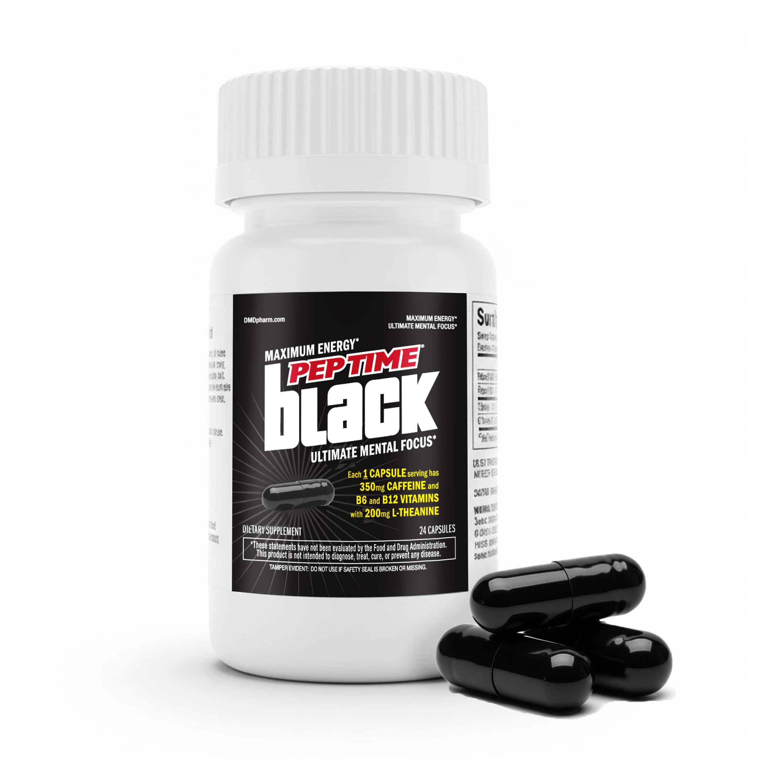 Introducing Peptime Black, a premium L-theanine and caffeine supplement designed to elevate your energy levels while minimizing jitters. Each capsule delivers a potent blend of 350mg pharmaceutical-grade caffeine and 200mg of L-Theanine, a natural amino acid known for its calming properties. Together, they form a powerful duo that supports calm and focus, ensuring you remain steady and in control during your most demanding tasks. Whether you're navigating a hectic workday, powering through a rigorous workout, or pulling an all-nighter, Peptime Black offers the energy support you need without the crash commonly associated with energy drinks. Our energy pills for women and men are diet-compatible, featuring zero sugar and zero calories, making them an excellent choice for those mindful of their intake. Experience lasting performance with Peptime Black, as it fuels your body without the overstimulation. Ideal for athletes aiming for peak performance, professionals tackling challenging projects, or students needing sustained focus, our caffeine pills are your go-to energy supplements. Peptime Black is superior to traditional caffeine pills and caffeine gummies. Our formula smooths intensity, preventing the unwanted spikes and crashes. Elevate your energy naturally and effectively with Peptime Black, a trusted choice in caffeine tablets, and join countless others who rely on its advanced formula for a balanced energy boost. Choose Peptime Black today and redefine your energy experience.Suggested use - As a dietary supplement, adults 18 years and older may take 1 capsule with an eight-ounce glass full of water. Do not take more than 1 capsule per day. it is recommended not to exceed 400 mg of caffeine daily. improper use of this product may be hazardous to a person's health. keep out of reach of children. Lasting performance - This potent blend fuels your workouts, long shifts, or late nights without the jitters, sugar, or crash of energy drinks. L-Theanine works alongside caffeine to smooth intensity, keeping you focused, steady, and in control. Perfect for athletes pushing for peak performance or professionals looking for stay awake caffeine pills that will power them through demanding days. Diet compatible - Zero sugar, zero calories, zero crash. L-Theanine and energy supplements - Peptime Black is designed for those who need maximum energy with minimum jitter. Each energy pill delivers 350mg of pharmaceutical-grade caffeine and 200mg of L-Theanine — a natural amino acid that helps support calm and focus while reducing overstimulation.