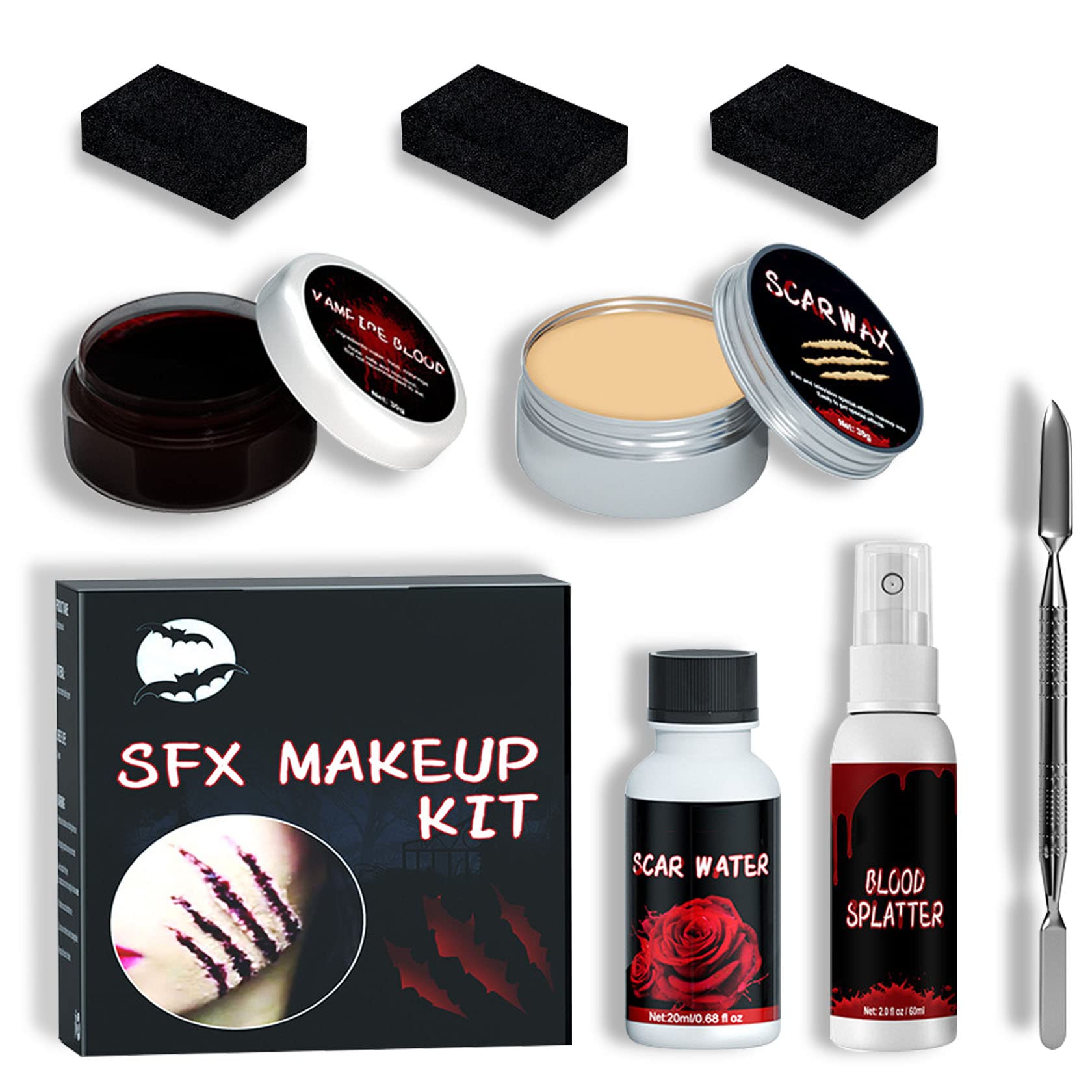 ?Best Gift?This special effects makeup kit is very suitable as a Halloween gift for friends and family around you, let them make up and feel the happy atmosphere of Halloween together, easy to operate, suitable for beginners and professional makeup artists. ?Quick Makeup Remover?SFX makeup kit is easy to remove, wash with warm water and soap, scrape off with a spatula, then wash off with a makeup remover. ?Safe and Skin-Friendly?The special effect makeup set is made of natural and gentle materials, suitable for all skin types. You can mix and match according to the look you want for horror and creepy special makeup. ?Create a special effects makeup?You can use our scar wax kit to create realistic effects such as scars and wounds, cuts, bullet holes, large wounds, bites, burns, blisters, quick lips, broken noses, bumps, torn Face, prosthetic makeup, zombie makeup, etc. ?Set Composition?Halloween Makeup Kit includes: 1pcs double-headed spatula, 1pcs fake blood spray, 1pcs fake blood gel, 1pcs scar wax, 1pcs scar water, 3pcs stipple sponge. Great for Halloween party makeup, stage makeup, cosplay and costume makeup.