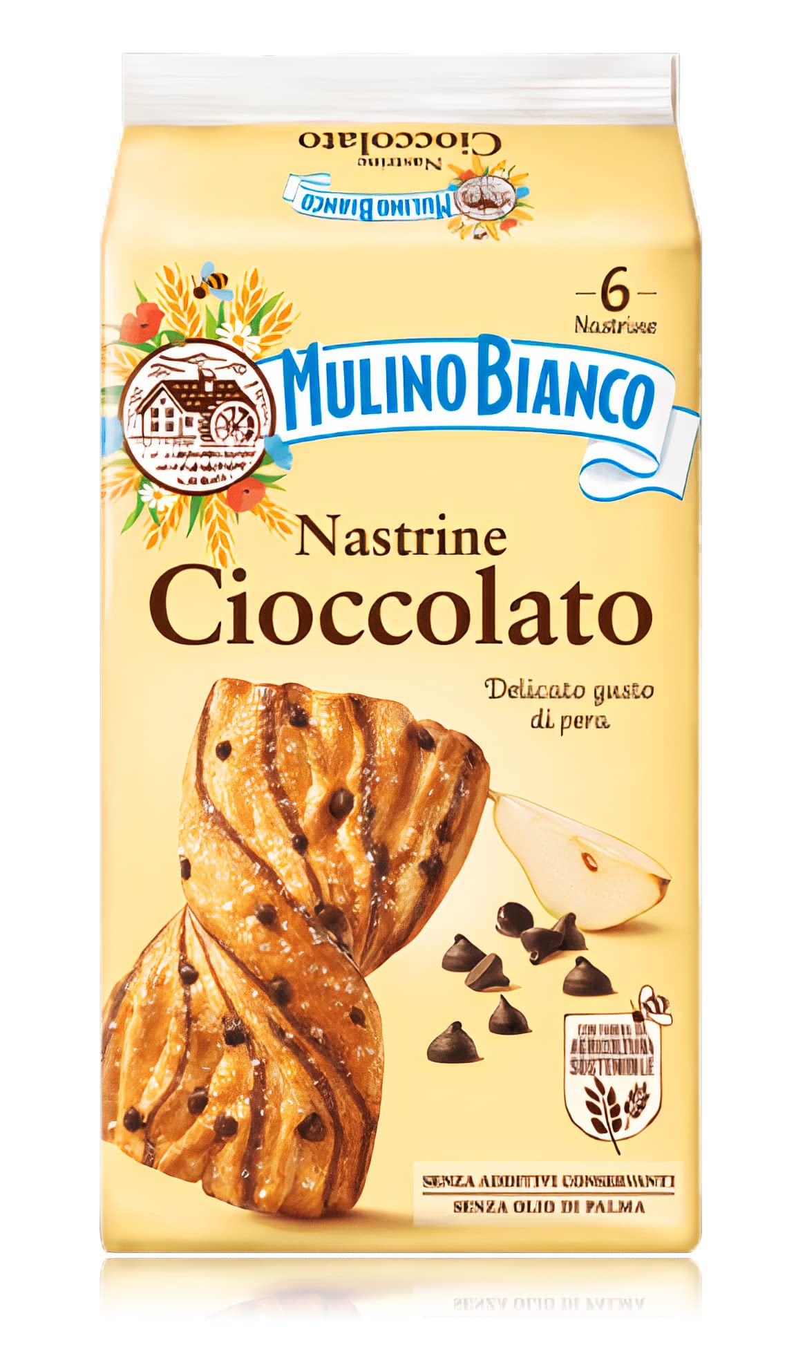 With: wheat flour 35.1 , vegetable margarine (cocoa butter, sunflower oil, coconut oil, water), sugar, water, sourdough starter (wheat), pears 6.7 , chocolate 6.6 (cocoa mass, sugar, cocoa butter, emulsifier: soy lecithin), fresh eggs, glucose-fructose syrup, cocoa, butter, emulsifiers: mono- and diglycerides of fatty acids, yeast, egg yolk, flavorings, sunflower oil, salt, starch, vegetable fiber, acidity regulator: citric acid. May contain traces of nuts. The highlighted ingredients may cause reactions in people with allergies or intolerances. Free from: palm oil, coloring additives, preservative additives, hydrogenated fats.Moulin blanc Rubans Brioche de pâte feuilletée avec gouttes de chocolat et goût délicat de poire 240 gDESCRIPTION DU PRODUIT Avec : farine de blé 35,1 , margarine végétale (beurre de cacao, huile de tournesol, huile de coco, eau), sucre, eau, levure mère (blé), poires 6,7 , chocolat 6,6 (pâte de cacao, sucre, beurre de cacao, émulsifiant : lécithine de soja), œufs frais, sirop de glucose-fructose, cacao, cacao, cacao, cacao, cacao, cacao, cacao, cacao, cacao, cacaao, beurre, emm ulsifiants: mono et diglycérides d'acides gras, levure, jaune d'oeuf, arômes, huile de tournesol, sel, amidon, fibres végétales, correcteur d'acidité : acide citrique. Peut contenir des traces de fruits à coquille. Les ingrédients mis en évidence peuvent provoquer des réactions chez les personnes allergiques ou intolérantes. Sans : huile de palme, additifs colorants, additifs conservateurs, graisses hydrogénées.