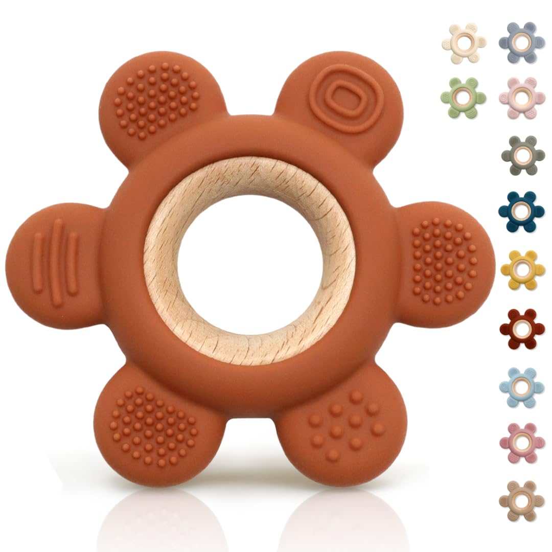 CAJA Beißring Baby - Zahnungshilfe - Beissring Blume - Beißspielzeug - Zahnen - Nursing - Zubehör Silikon für Babys ab 3 Monaten (chocolate)