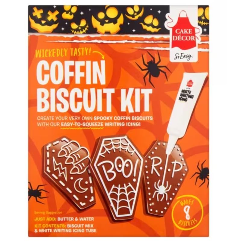 Suitable for Vegetarians. Just Add: Butter Water. Create Your Very Own Spooky Coffin Biscuits with Our Easy-to-Squeeze Writing Icing!. Wickedly Tasty!. Our super spooky Cake Décor Pumpkin Biscuit Kit for truly terrifying treats!. Chocolate Biscuit Mix and White Writing Icing Tube.