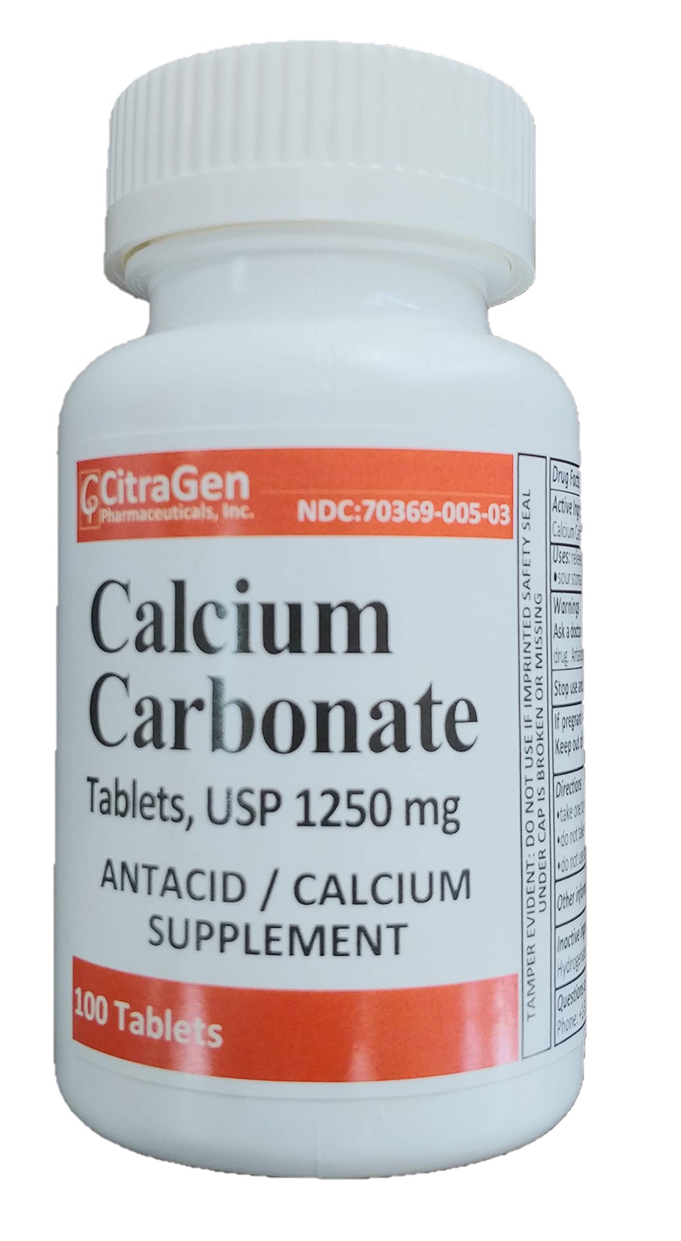 Calcium Carbonate Tablets USP 1250 mg for Relief of Acid Indigestion Heartburn Sour Stomach Upset Stomach and as Calcium Supplement 100 Tablets per Bottle by CitraGen Pharmaceuticals Inc