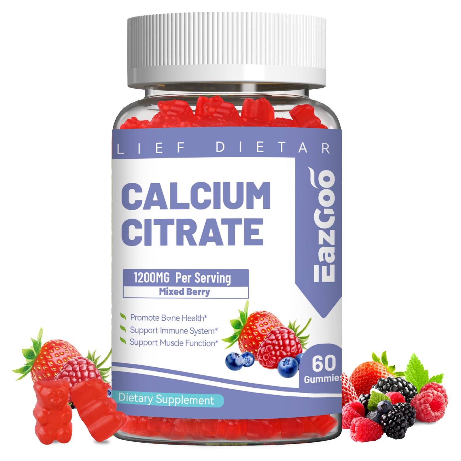 Premium Quality: Our delicious, healthy calcium gummies are made with natural and VEGAN ingredients they are FREE FROM gluten, gelatin, artificial colors, flavors, or preservatives. We are dedicated to offering the best quality products at the best value. Multiple Health Benefits: Calcium is essential for supporting overall body health. Our calcium citrate gummies support Immune muscle health, or simply ensure optimal calcium intake. Calcium gummies offer a tasty and effective solution for active lifestyles and long-term health maintenance. Calcium Chews for All Ages: No need to swallow large pills. Our calcium supplements for women are easy to take and less likely to cause constipation or other problems. Whether you're on the go or at home, these absorbable calcium citrate gummies are a convenient, enjoyable way to boost your daily calcium intake. Calcium Citrate 1200mg Gummies: Sugar-Free chewable calcium supplements deliver 1200mg calcium per serving, optimized for superior absorption and bioavailability to maintain your body's structural strength and density. Calcium gummies have a natural Mixed Berry flavor for a pleasant taste with no aftertaste. They are easy to digest, won't stick, and won't burden the body. High Absorption Calcium Gummies: Unlike traditional calcium supplements, calcium citrate gummies are gentle on the stomach—even for those with low stomach acid. Additionally, calcium citrate offers optimized absorption and bioavailability, ensuring that your body can efficiently absorb and utilize the essential calcium it needs.