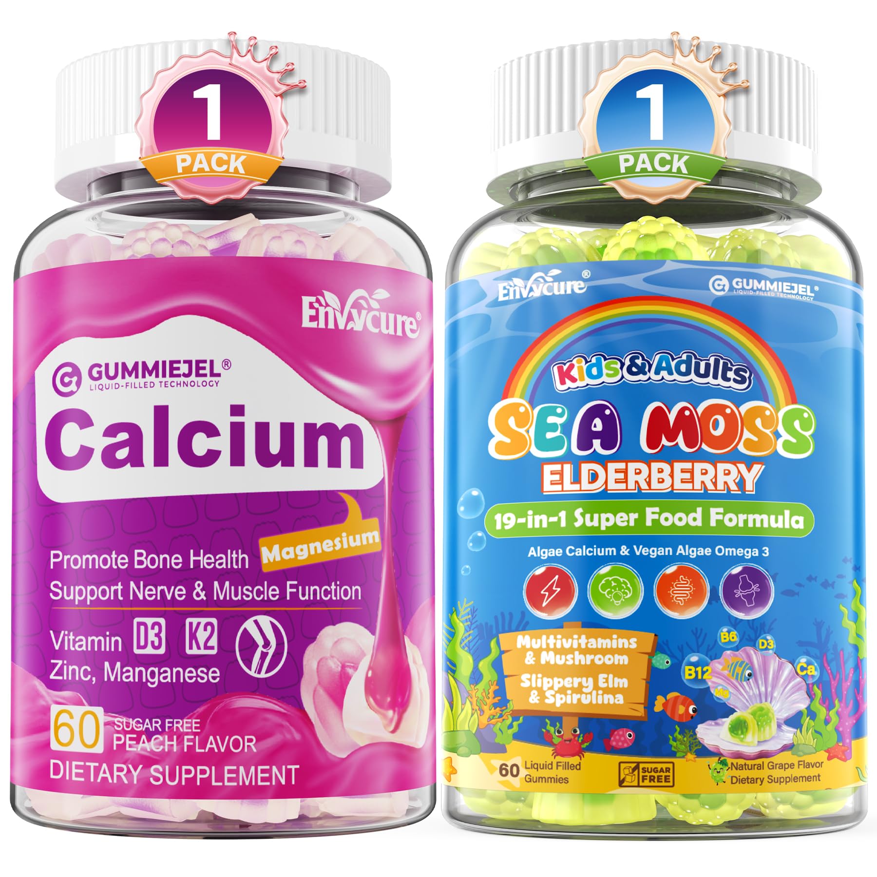 [Premium All-in-One Sea Moss Formula for Kids Adults] - This ultra-complete sea moss gummy features a 19-in-1 blend of marine minerals, vitamins, plant-based omega-3s, mushrooms, herbs, and superfoods—delivered with advanced dual-layer GummieJel technology. One or two daily chew provides broad whole-body nutrition to support immune, digestion, bone jo?int strength, energy, brain, and skin wellness. Thoughtfully formulated for kids (4 ) and adults for clean taste and everyday family use! . [Liquid Filled Gummies] - Want to maintain bone health and density? Try this calcium gummy with Calcium Citrate 1000mg, Vegan Vitamin D3 K2, Magnesium, Zinc, Manganese, Boron and Copper. The unique gummy-filled technology mixes the ingredients with oil and injects them into the center of the gummy, offering an Ultra High Absorption rate compared to ordinary calcium gummies.