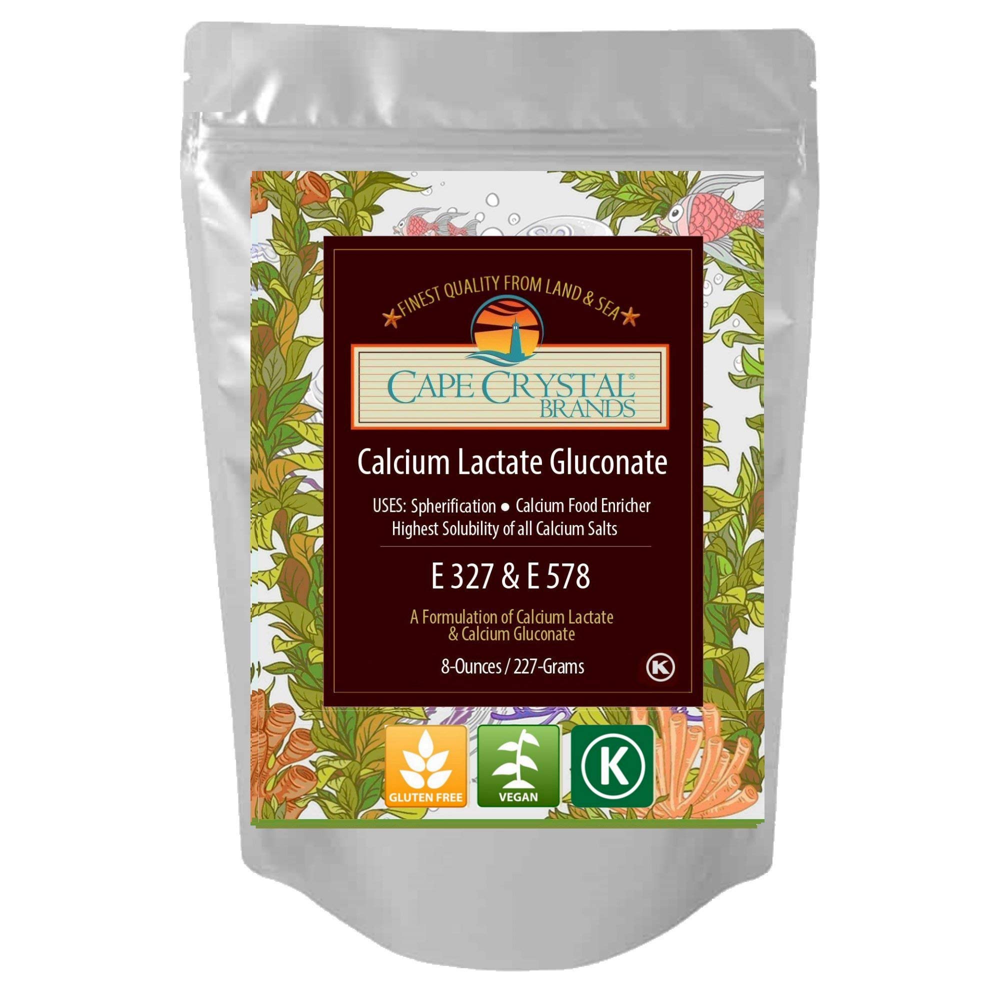 Calcium Lactate Gluconate - For Reverse Spherification (E327 E578) is used as a catalyst in the reverse spherification process for liquids high in acids and alcohols in conjunction with sodium alginate when making spheres. The procedure results in spheres that gel on the outside and remain liquid in the center. Calcium Lactate Gluconate - For Reverse Spherification Cape Crystal Brands is perfect for reverse spherification (dipped in sodium alginate bath) without adding any flavor at all to the product. It is soluble in cold liquids and can be used with acidic, high alcohol, or fatty mediums. This product is certified Kosher (Pareve) by OK Kosher