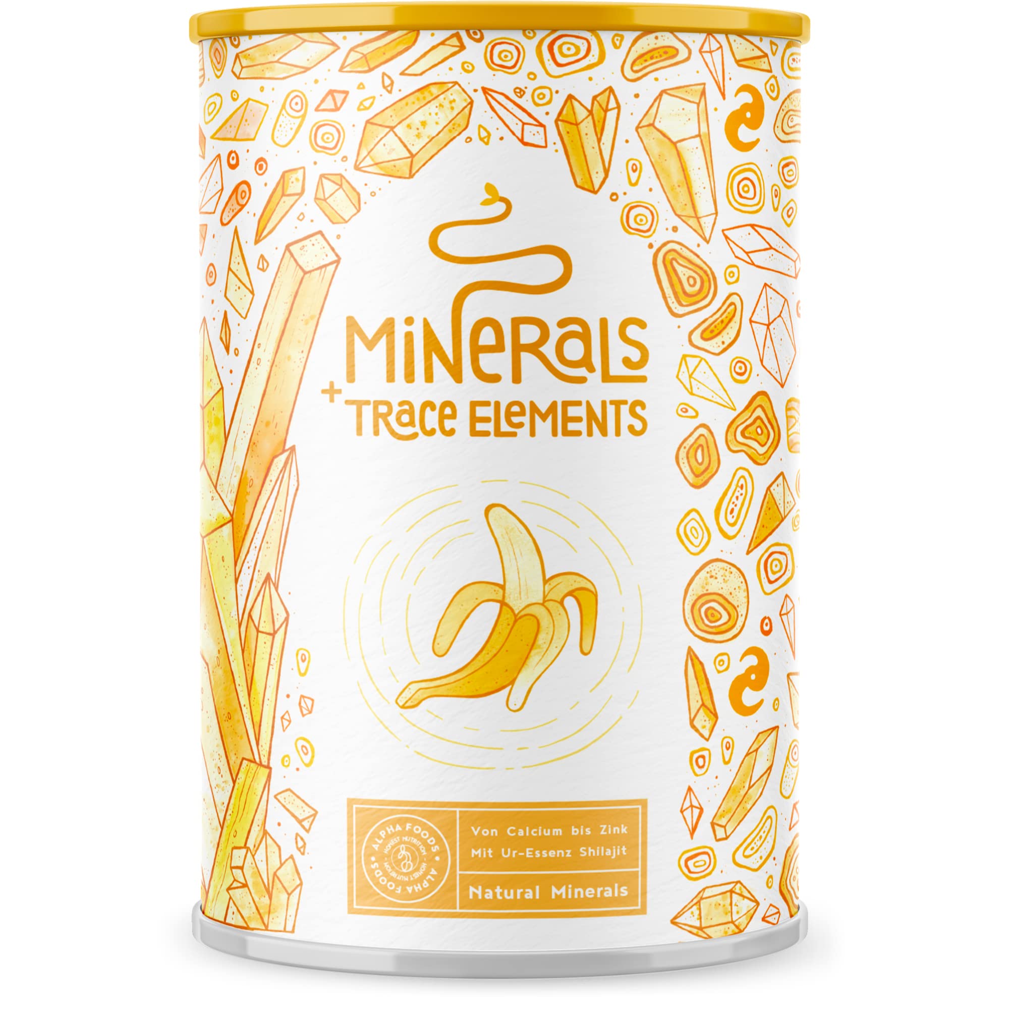 DEVELOPED WITH HEART AND MIND - Our raw materials are the foundation, the heart of all Alpha Foods and the basis of complex, value-added elixirs, proteins and rituals, bottled in small batches. We develop and produce powerful plant-based foods and nutritional supplements, with clean ingredients to activate your body. PROVEN PURITY AND POTENCY - While we have long-lasting and deeply trusted relationships with all our family-owned farmers and growers, we still have every single batch lab checked by a fully certified and independent German laboratory before it leaves our production facility. Alpha Foods quality products are manufactured in state-of-the-art facilities according to the highest quality standards. VEGAN-FRIENDLY: Natural, optimally bioavailable compounds. Without separating agents, carriers, flavourings, colourings, stabilisers. Alpha Foods minerals are 100 vegan, lactose-free, preservative-free and free from genetically modified ingredients (GMO). Our Minerals and Trace Elements are great for boosting other alpha foods, but can also be mixed with juice or used in cooking. This powder has a natural banana flavour that is subtly sweetened with plant-based stevia. WHY TAKE MINERALS TRACE ELEMENTS - Our Mineral Supplements powder contains important minerals for the body, such as Calcium, Magnesium and Zinc, which contribute to: the normal function of the immune system, reduction of tiredness fatigue, maintenance of normal bones and teeth, and normal muscle function. All claims substantiated by EFSA. The added primordial Shilajit Essence optimises bioavailability and is 100 hand-harvested mumijo with humic and fulvic acid. ESSENTIAL MINERALS - Our Minerals and Trace Elements powder is an optimally bioavailable mixture with all essential minerals and trace elements, including potassium, magnesium, iron, zinc, manganese, copper, chromium, iodine and selenium. Due to its powder form, the minerals can be dosed in accordance to individual needs.