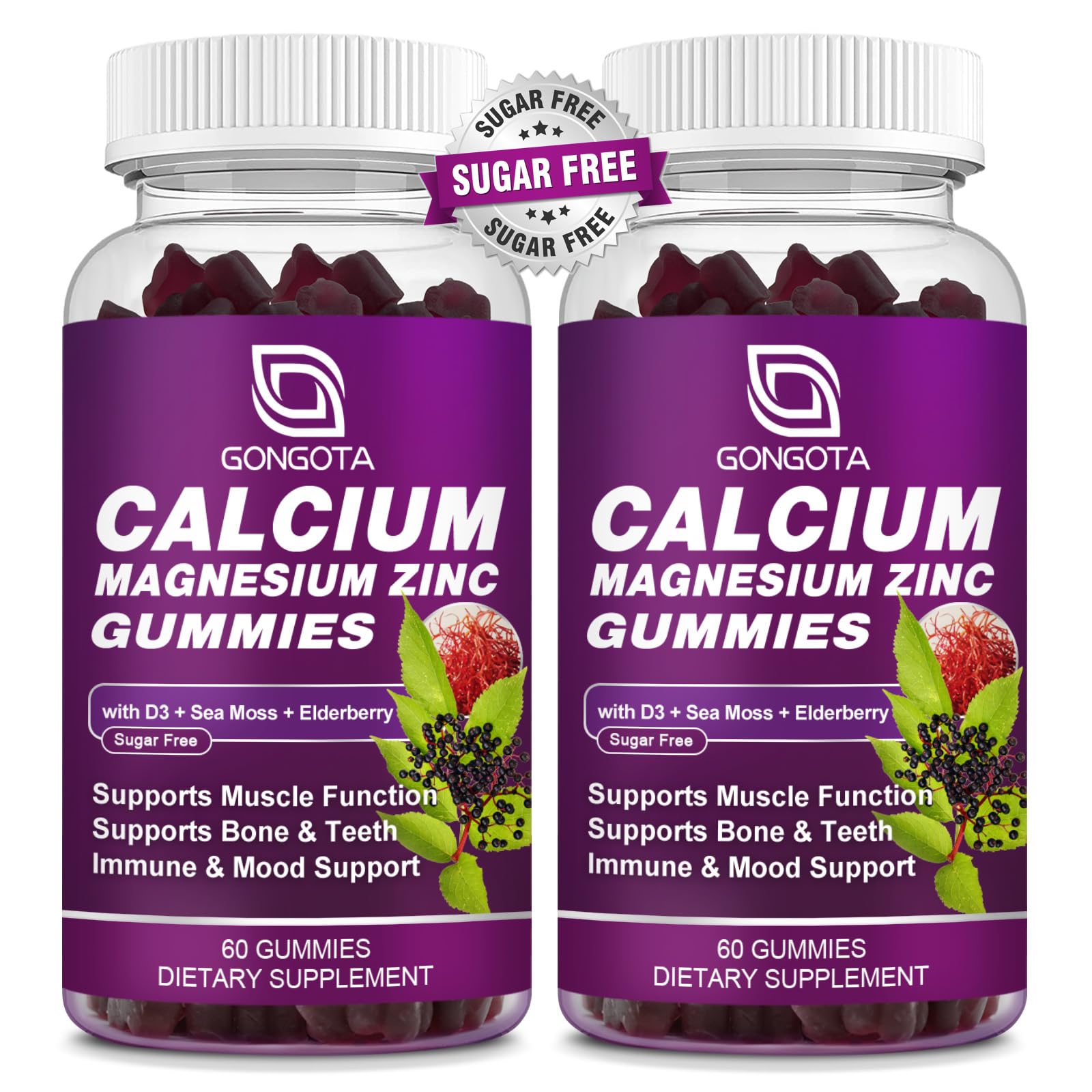 Calcium Magnesium Zinc with Vitamin D3 Supplement, Highly Absorbent Calcium Gummies with 300mg Magnesium glycinate Support Bone & Teeth, Muscle for Adults and Teens,Sugar Free, Vegan (2 Pack) Elderberry 60 Count (Pack of 2)