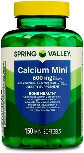Convenient mini softgels that are easy to swallow. Free from gluten, lactose, and artificial colors, flavors, and preservatives. Calcium is an essential mineral that promotes bone health and strength, ensuring optimal skeletal function and structure. Vitamin D3 is an active form of vitamin D that facilitates calcium absorption in the body. Delivers 600 mg of calcium and 12.5 mcg (500 IU) of Vitamin D3 per serving. Spring Valley Calcium Mini plus Vitamin D3 Mini Softgels, 150 Count.