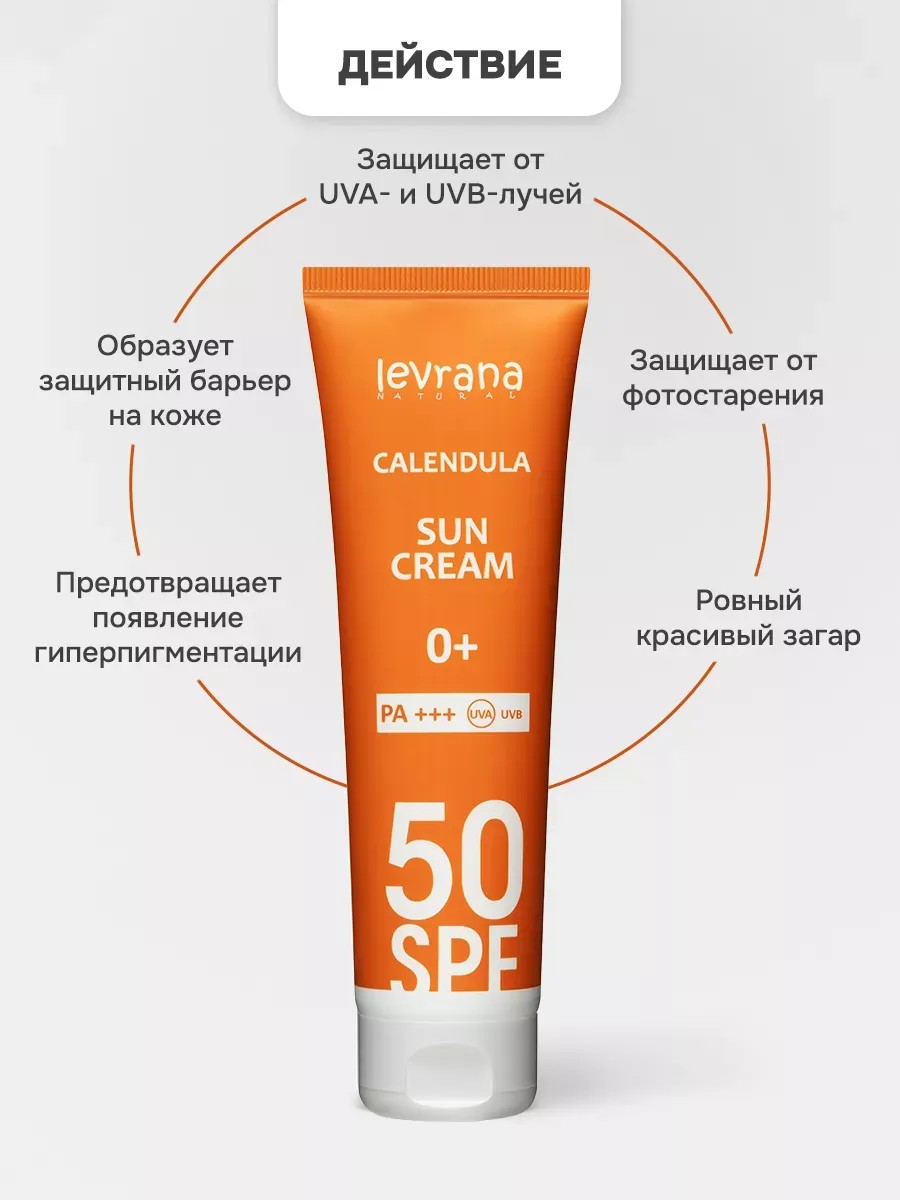 Дневной солнцезащитный крем Календула СПФ 50+ для лица и тела 0+ предназначен для защиты кожи от солнечных ожогов и фотостарения для всей семьи. Он имеет самый высокий фактор защиты от вредного воздействия ультрафиолета. Обеспечивает мгновенную, максимально бережную защиту даже для самых маленьких детей. Солнцезащитное средство на основе физических фильтров оксида цинка (Zinc Oxide). Механизм действия заключается в способности преломлять ультрафиолет от поверхности кожи и защищать ее от получения солнечного ожога. При нанесении не впитывается в кожу, а создает на поверхности защитный экран, который как зеркало отталкивает и рассеивает все типы лучей: UVB, UVA1 и UVA2. Минеральные фильтры гипоаллергенны и безопасны, рекомендованы для защиты чувствительной, раздраженной и детской кожи, не разрушаются под воздействием УФ, дольше сохраняют свою фотостабильность. Водостойкий крем обогащен большим количеством противовоспалительных и матирующих ингредиентов. Экстракты грецкого ореха и шиповника удерживают влагу в коже, тонизируют, сохраняют эластичность и бережно заживляют. За счёт эфирных масел и витамина Е крем богат антиоксидантами, защищает от преждевременного старения, активирует восстанавливающие процессы в коже, смягчает и повышает её упругость. Особенностью такого средства является плотная текстура, его нужно наносить тонким слоем, хорошо распределяя по коже. Так как физические фильтры базируются на поверхности эпидермиса, то легко смываются водой или стираются одеждой. Важно обновлять слой солнцезащитного крема на их основе не реже, чем каждые 2 часа и после каждого контакта с водой. Санскрин является водостойким. Подходит для детей с рождения от 0 лет и взрослых. Подготовьте кожу к безопасному и ровному загару вместе с солнцезащитным кремом Леврана. Универсальное солнцезащитное средство, которое эффективно защитит кожу, где бы вы ни находились — в городе или на курорте. У нас есть акции и распродажи, вы можете купить наши товары в подарок со скидкой!