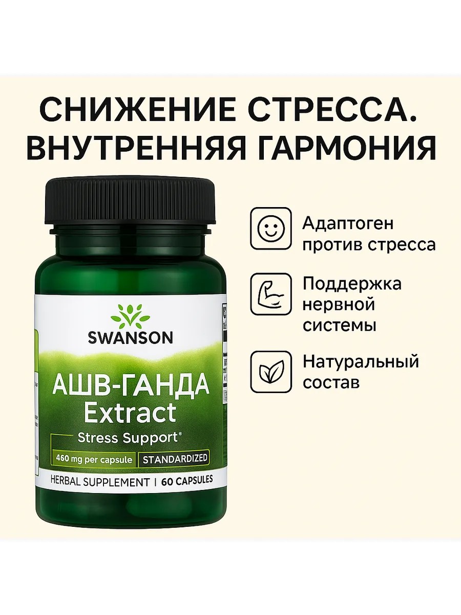 Swanson Ashv-Ganda Extract — это адаптогенная пищевая добавка, каждая капсула содержит 450 мг стандартизированного экстракта. Экстракт известен своими свойствами снижать уровень стресса, помогать в нормализации работы надпочечников, улучшать качество сна, поддерживать концентрацию и общее эмоциональное равновесие. Он способствует стабилизации уровня кортизола, повышает стрессоустойчивость, а также может положительно влиять на иммунитет и энергетический обмен. Продукт производится по стандартам GMP, не содержит глютен и ГМО, подходит для веганов и проходит независимый лабораторный контроль. Рекомендуется принимать по одной капсуле один-три раза в день во время еды, запивая водой. Средство особенно полезно для людей, испытывающих повышенные нагрузки, хронический стресс, проблемы со сном и сниженный уровень энергии. Курс приёма обычно длится 4–8 недель, после чего желательно сделать перерыв. Для усиления эффекта экстракт можно сочетать с магнием, витаминами группы B, омега-3 или пробиотиками. Перед началом применения рекомендуется проконсультироваться с врачом, особенно при беременности, кормлении грудью и хронических заболеваниях.