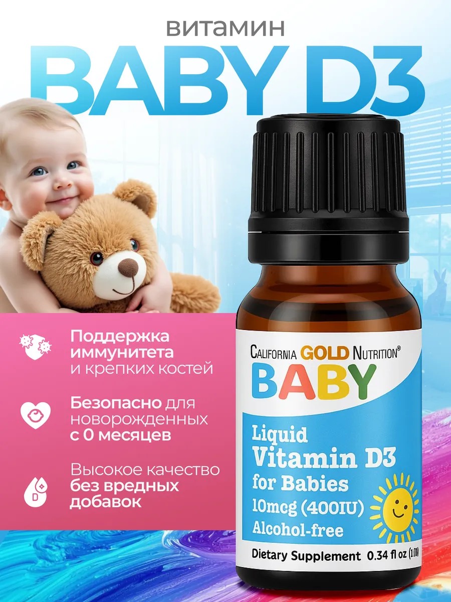 California Gold Nutrition Baby D3 400 МЕ – лучший витамин D3 для младенцев с первых дней жизни! Эти высокоэффективные капли с оптимальной дозировкой 400 МЕ разработаны специально для новорожденных и грудничков, чтобы обеспечить здоровое развитие костей и зубов, укрепить иммунитет ребенка и предотвратить дефицит витамина D. California Gold Nutrition предлагает чистый и безопасный продукт без ГМО, глютена и искусственных добавок – идеальный выбор для заботливых родителей, которые ищут качественный витамин D3 для детей. Купить Baby D3 400 МЕ – значит обеспечить своему малышу правильный рост и защиту от рахита с самого рождения. Наши капли с витамином D для новорожденных легко дозируются и усваиваются, помогая вашему ребенку расти крепким и здоровым. Выбирайте проверенное качество от California Gold Nutrition – лидера в производстве детских витаминов!