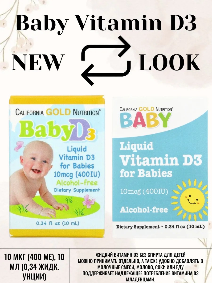 Витамин D3 для детей от California Gold Nutrition и Carlson labs обеспечивают ребенка достаточным количеством этого витамина в виде удобной жидкой добавки. Витамин D способствует усвоению кальция и фосфора — двух минералов, важных для укрепления костей и зубов. Обеспечение вашего ребенка достаточным количеством этого важного витамина в первые месяцы жизни способствует его здоровому росту. Производится из холекальциферола, получаемого из ланолина и проходящего многоступенчатый контроль качества. Согласно рекомендациям, младенцы должны получать витамин D в виде добавки, поскольку, находясь на грудном вскармливании, они обычно не получают достаточное количество витамин D из других источников. Ежедневно малышу рекомендуется давать по 1 капле (400 ед) витамина D от California Gold Nutrition до 1 года, с года по 3-4 капли в жидкой форме утром, начиная с первых дней жизни; Получили с новым сроком годности до 02.2027 года