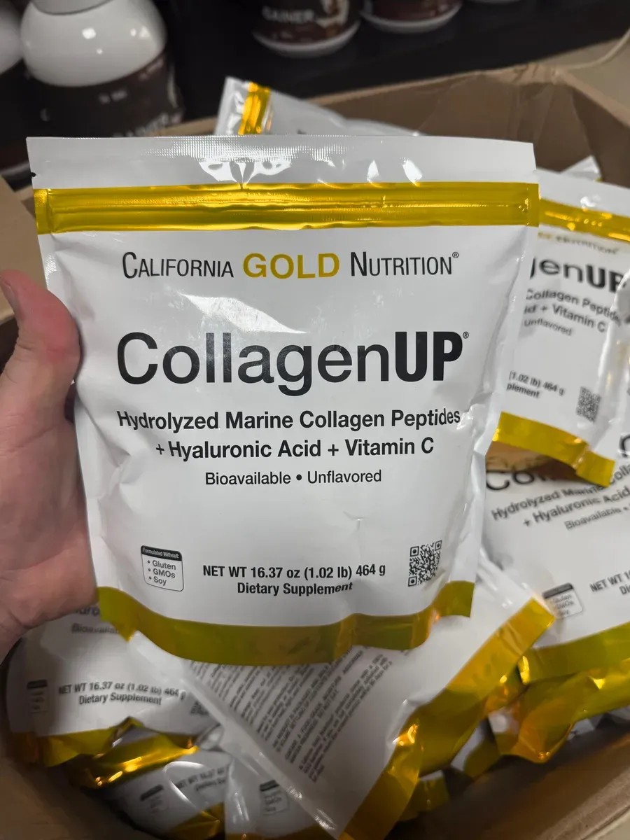 California Gold Nutrition CollagenUp, содержит пептиды морского коллагена без добавления бычьего коллагена, а также гиалуроновую кислоту и витамин C неживотного происхождения.