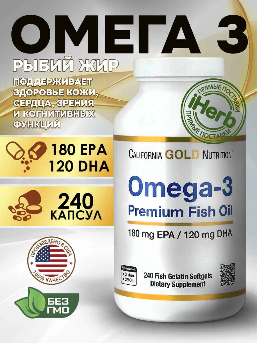 Рыбий жир омега-3 премиального качества от California Gold Nutrition — продукт молекулярной дистилляции, который содержит 180 мг ЭПК и 120 мг ДГК в одной капсуле из высокоочищенного и концентрированного натурального рыбьего жира от мировых производителей, соответствующий строгим стандартам контроля качества. Капсулы из рыбьего желатина не содержат свиных или бычьих ингредиентов и производятся в Калифорнии (США) из сырья от мировых производителей.