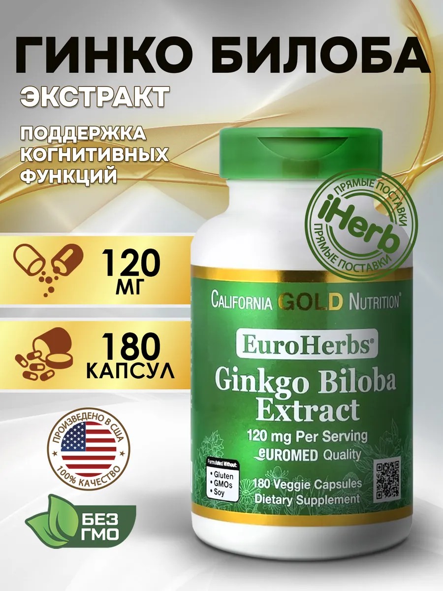 Гинкго билоба EuroHerbs от California Gold Nutrition содержит экстракт гинкго билоба премиального качества, стандартизированный до содержания 22% флавонгликозидов и 5% терпеновых лактонов. Зелёные растительные капсулы с красителем природного происхождения изготовлены из хлорофилла, полученного из листьев люцерны и шелковицы.