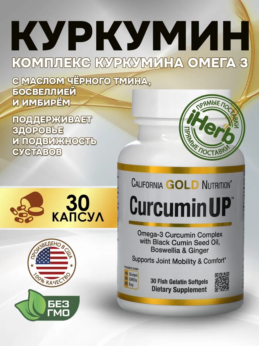 CurcuminUP от California Gold Nutrition — это улучшенное средство для поддержки нормальной воспалительной реакции с концентратом рыбьего жира, содержащее омега-3 жирные кислоты, масло из семян чёрного тмина, экстракты куркумы, босвеллии и имбиря в капсулах из рыбьего желатина.