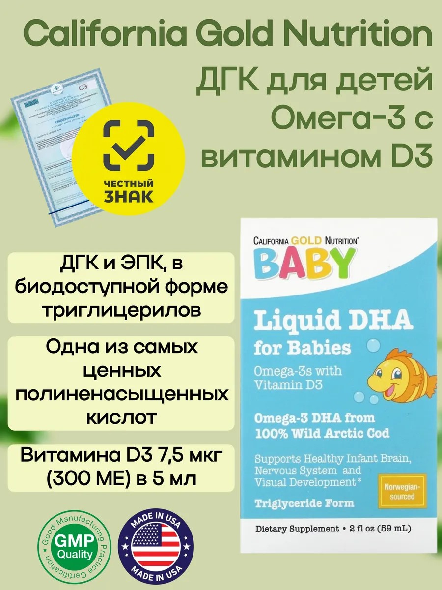 California Gold Nutrition Baby's DHA Omega-3 with vitamin D3 – это высококачественная добавка для детей, разработанная в США. Продукт содержит 100% омега-3 жирные кислоты из дикой арктической трески и витамин D3, которые способствуют развитию мозга, нервной системы и зрения у малышей.